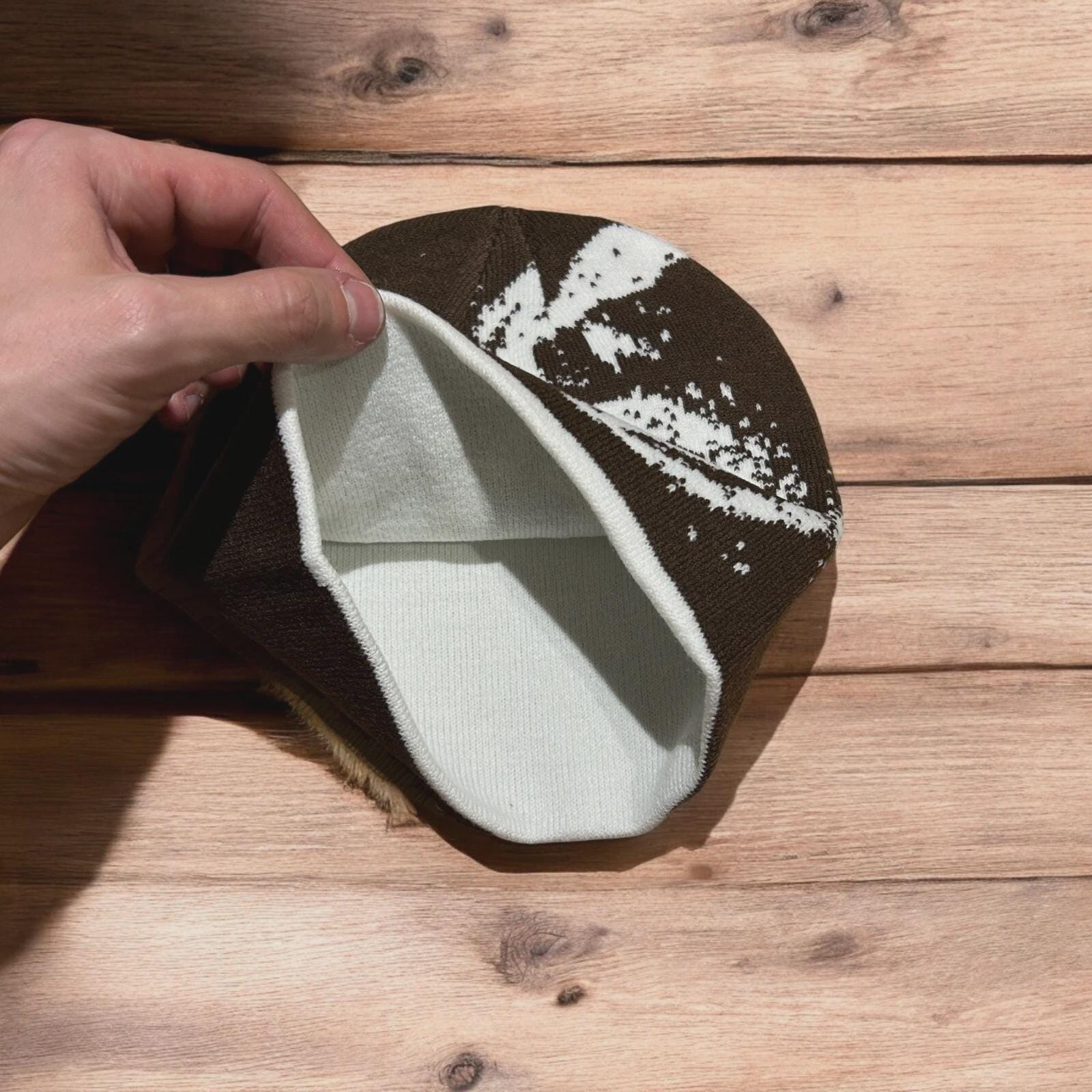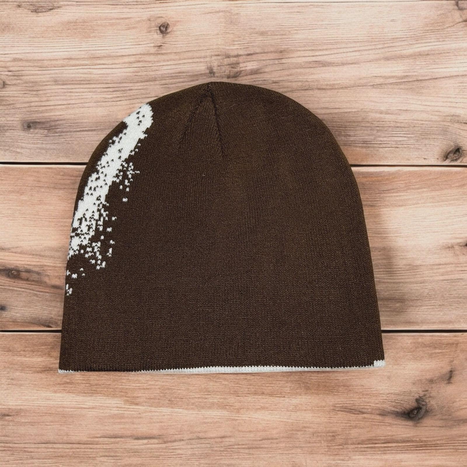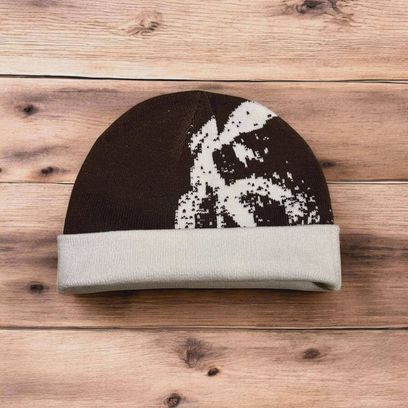 Cool Japanese vintage style beanie hat in brown with graphic design. One size.