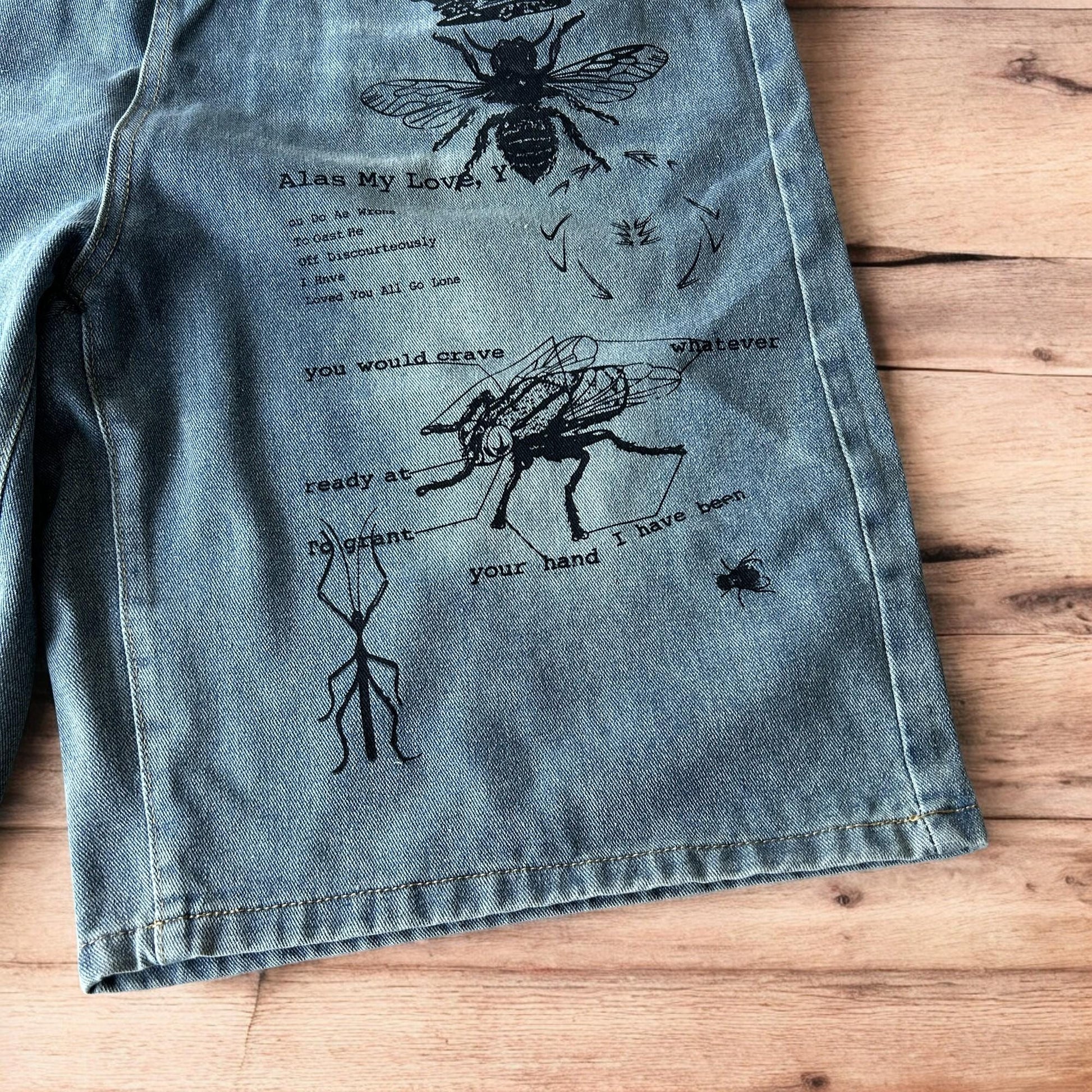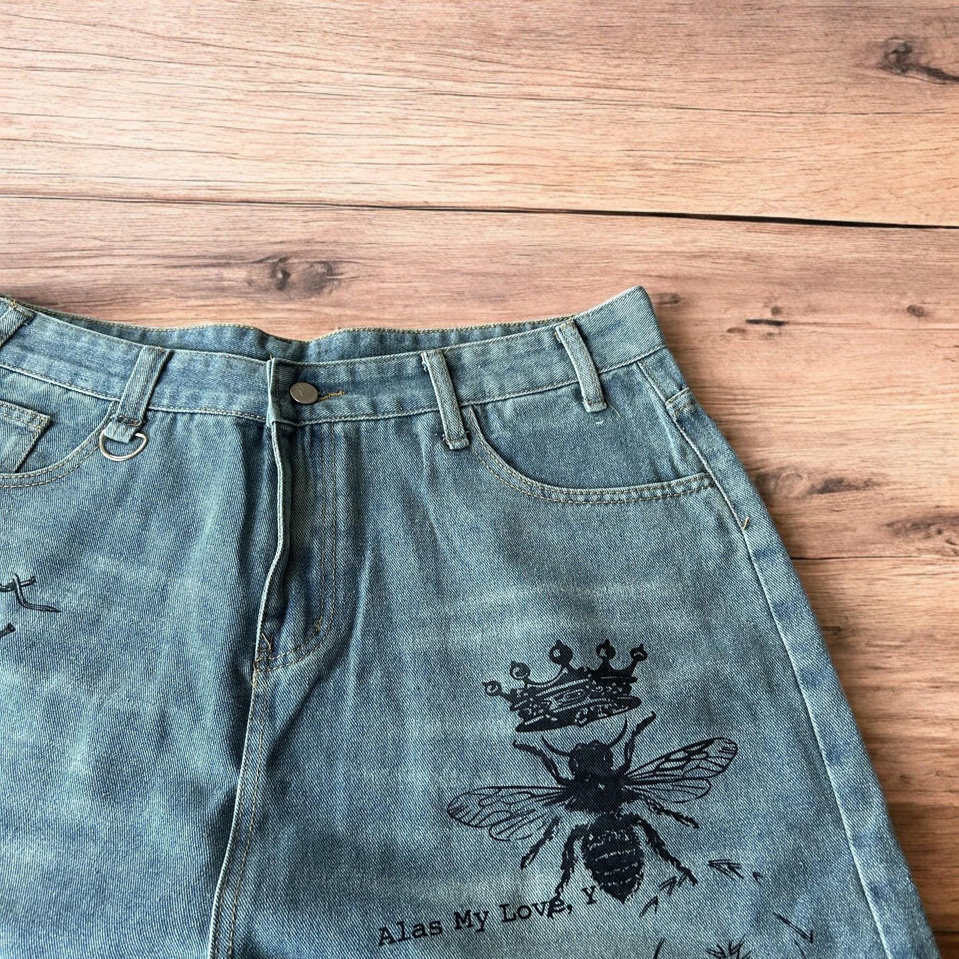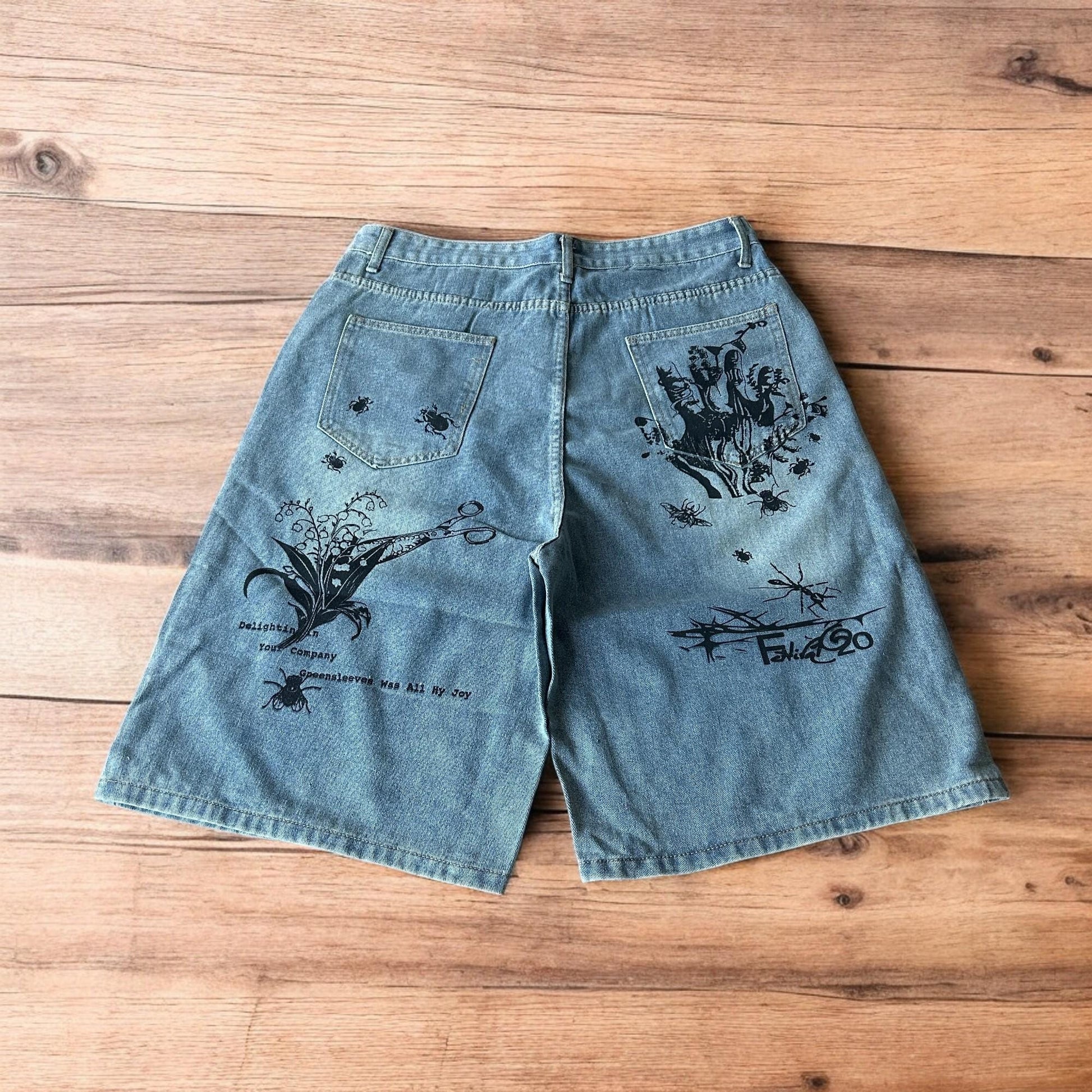 Incredible baggy wide leg denim shorts jorts with graffiti/graphic in light blue.