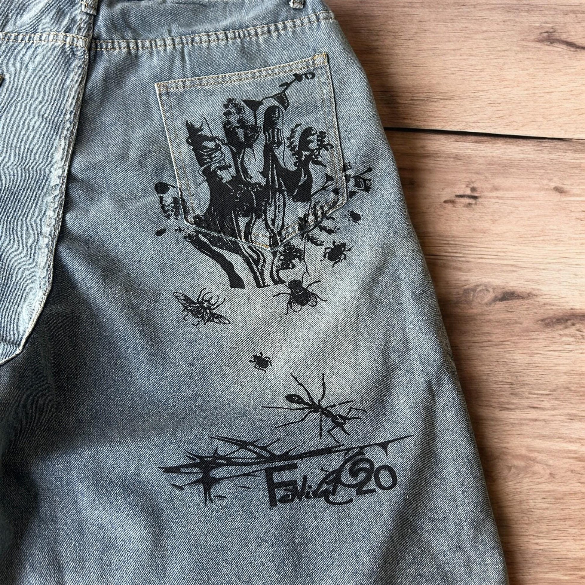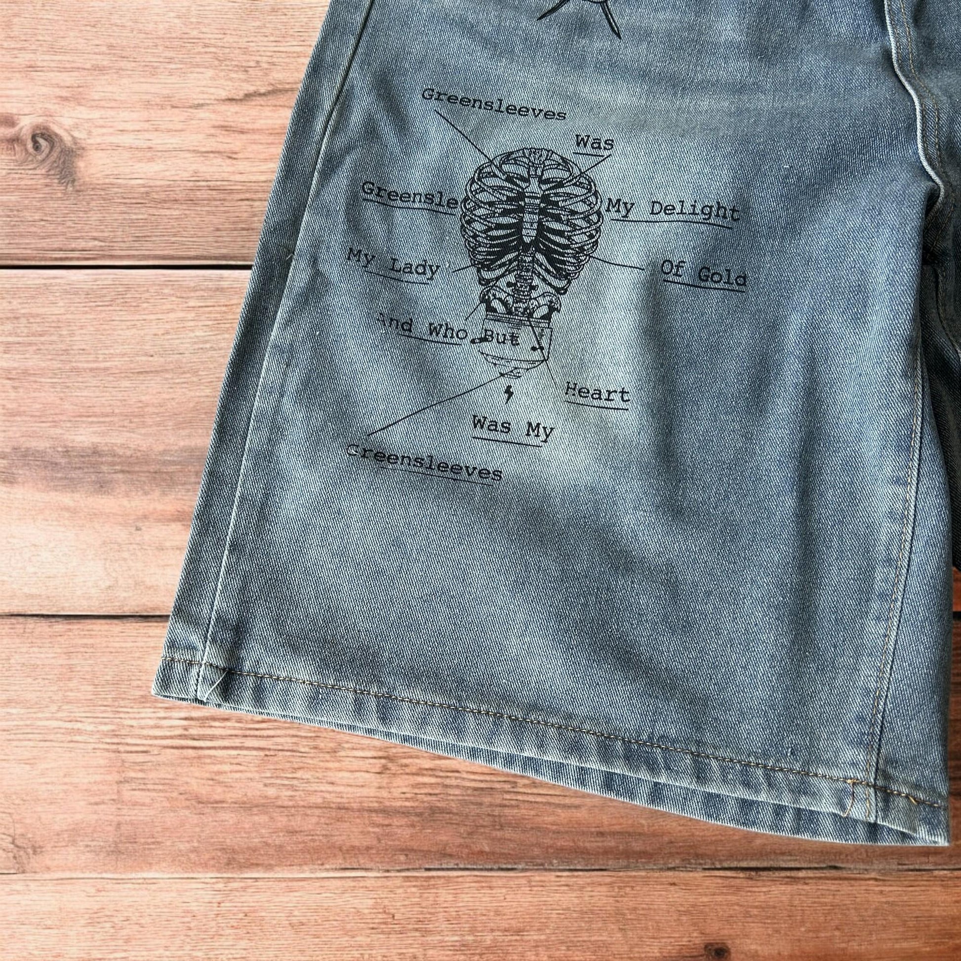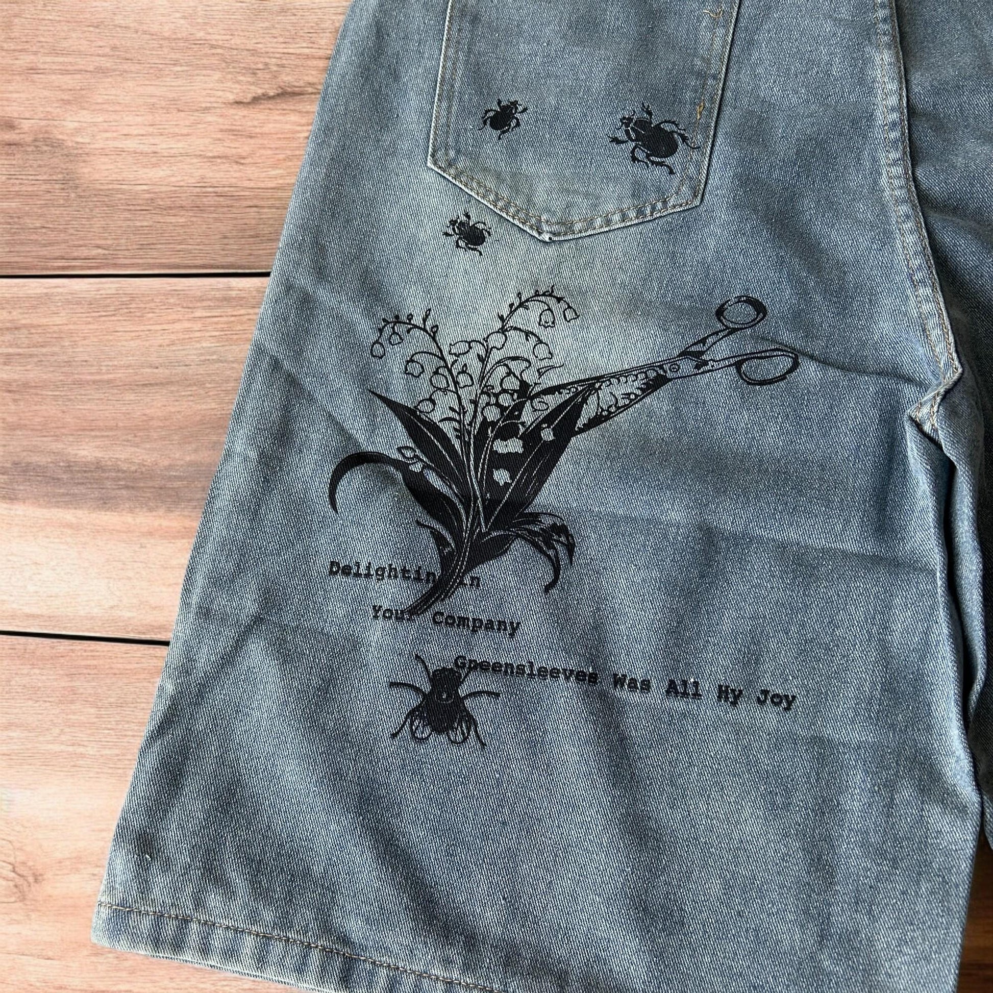 Incredible baggy wide leg denim shorts jorts with graffiti/graphic in light blue.