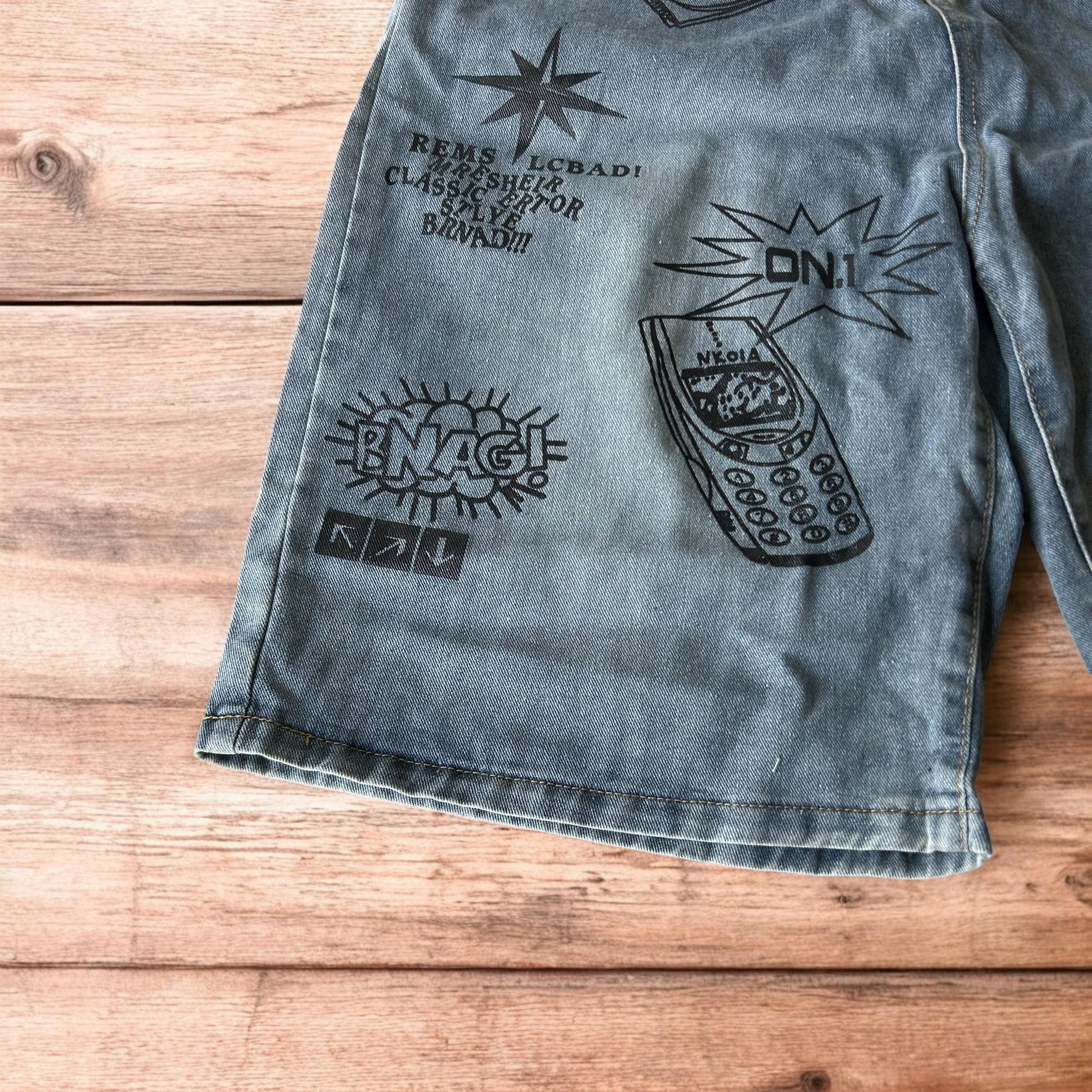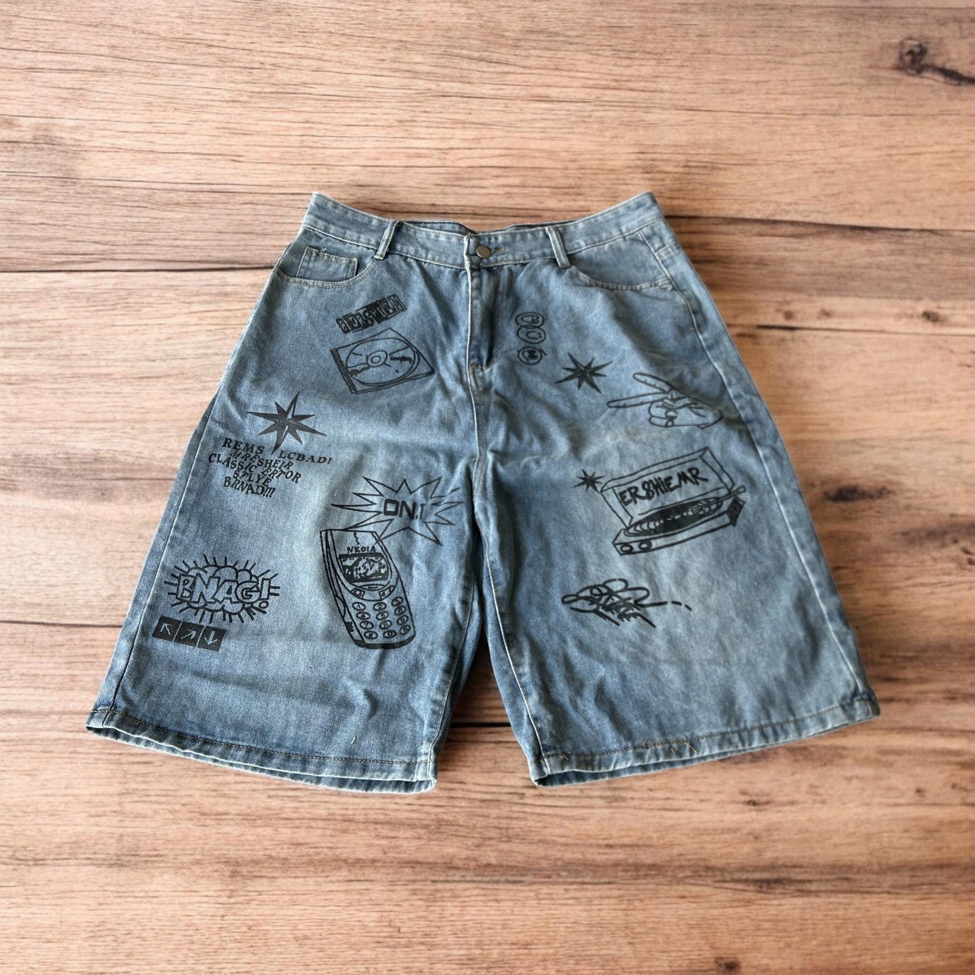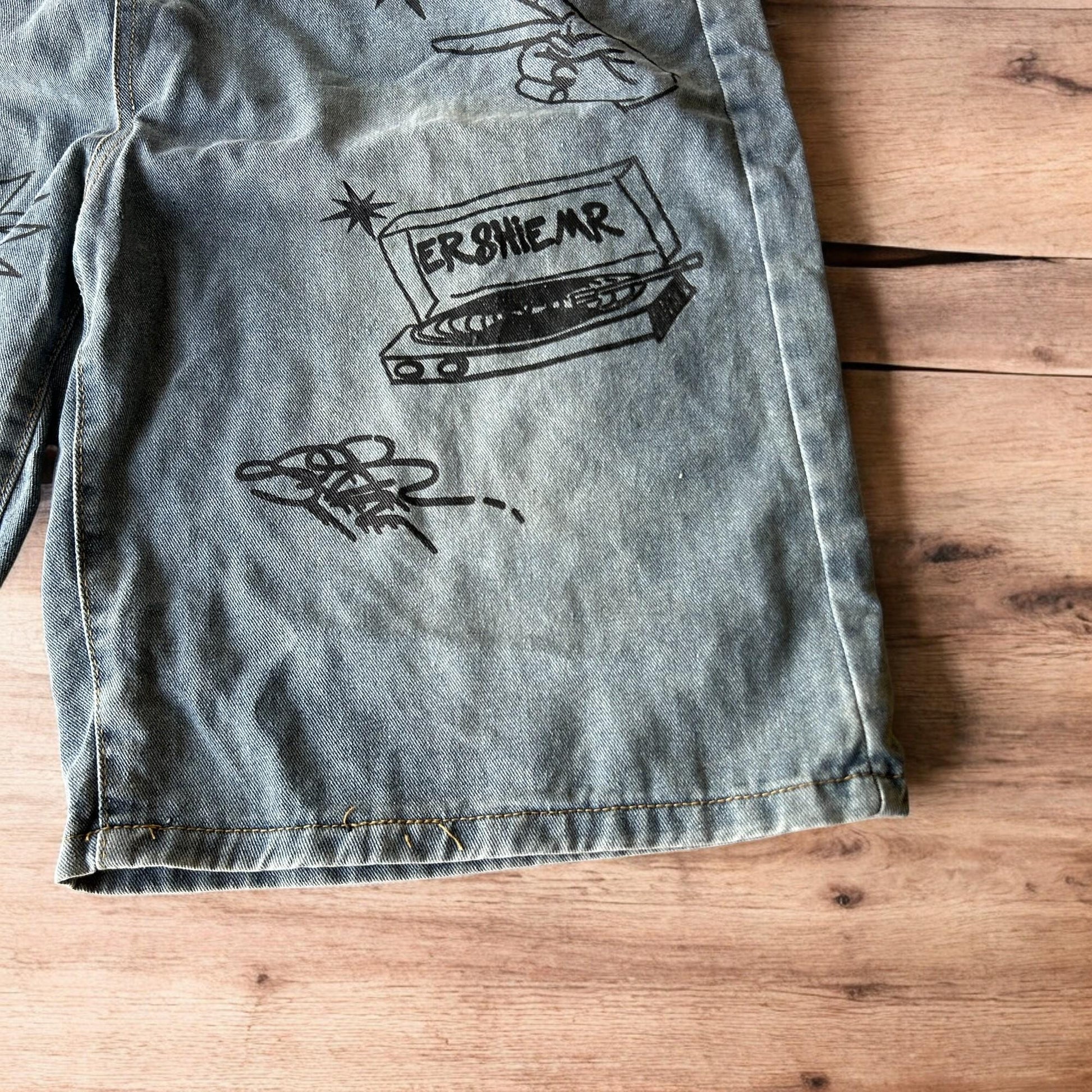 Incredible baggy wide leg denim shorts jorts with graffiti/graphic in light blue.