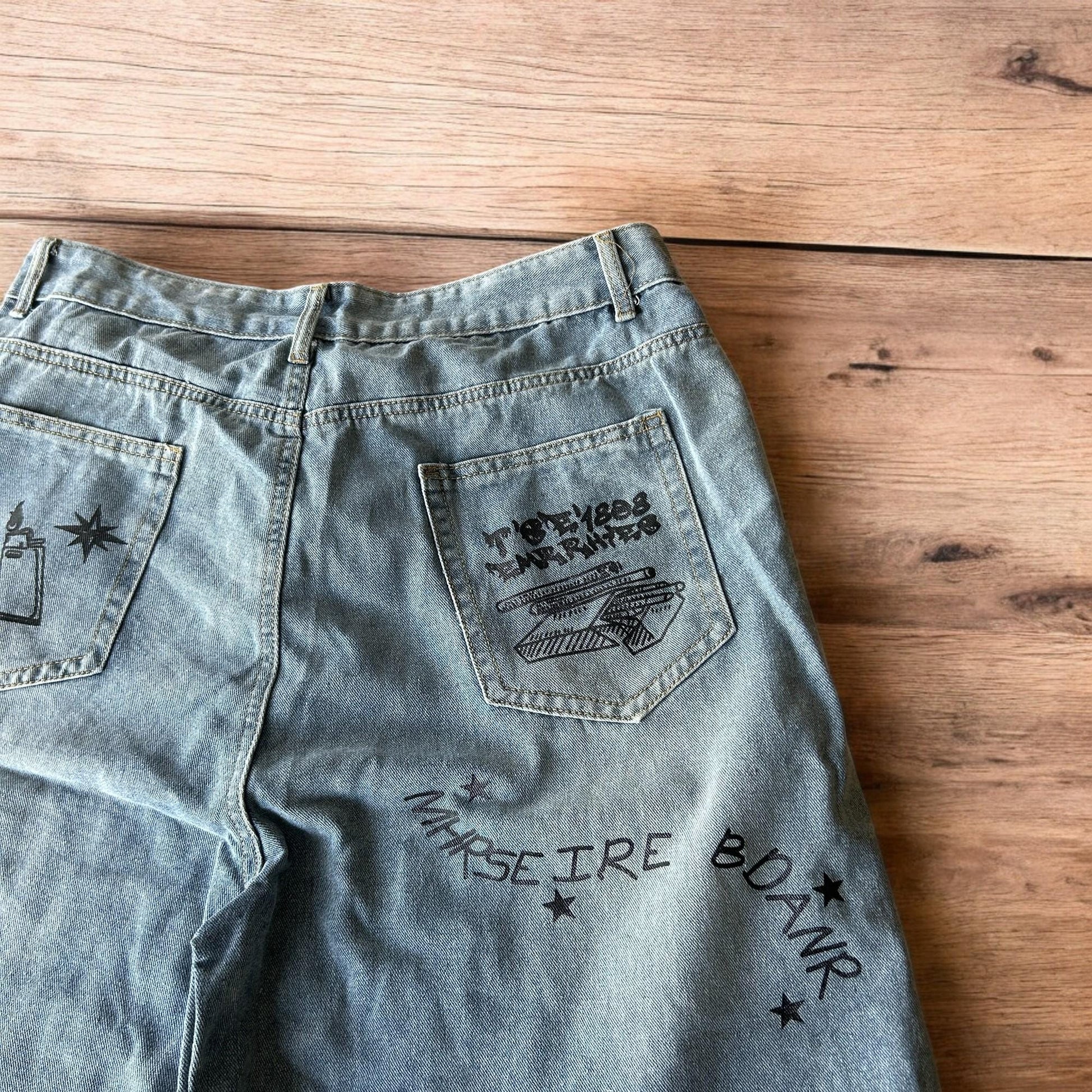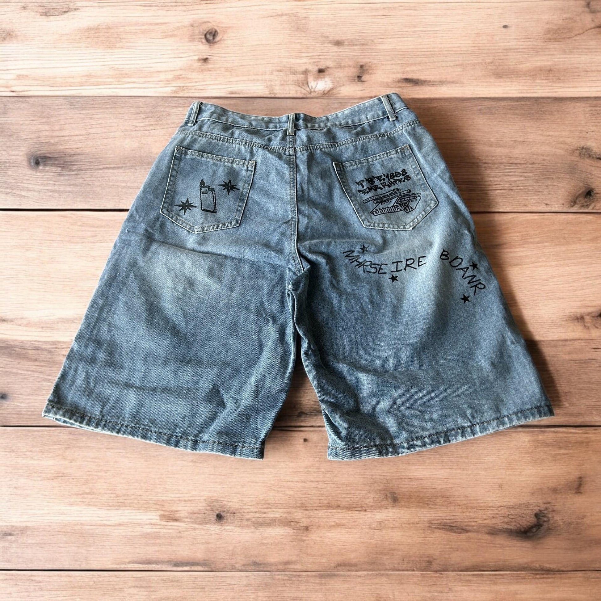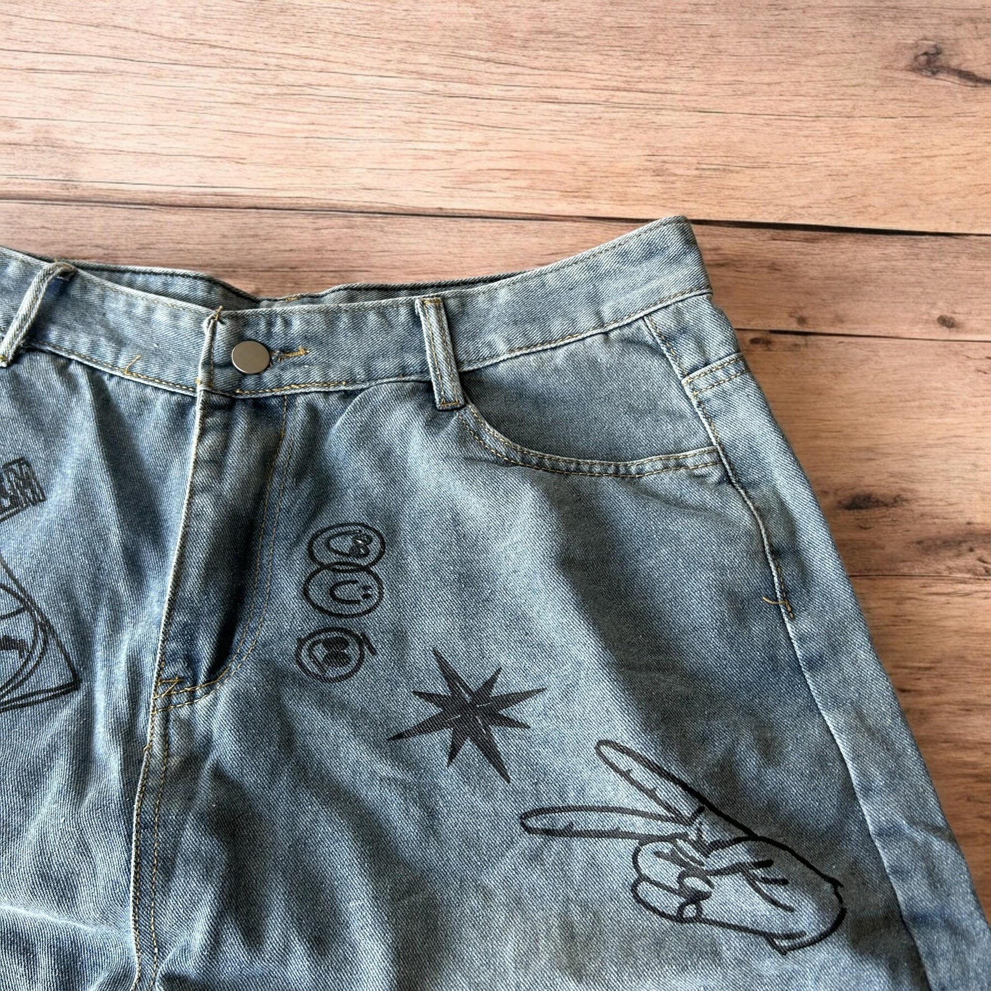 Incredible baggy wide leg denim shorts jorts with graffiti/graphic in light blue.