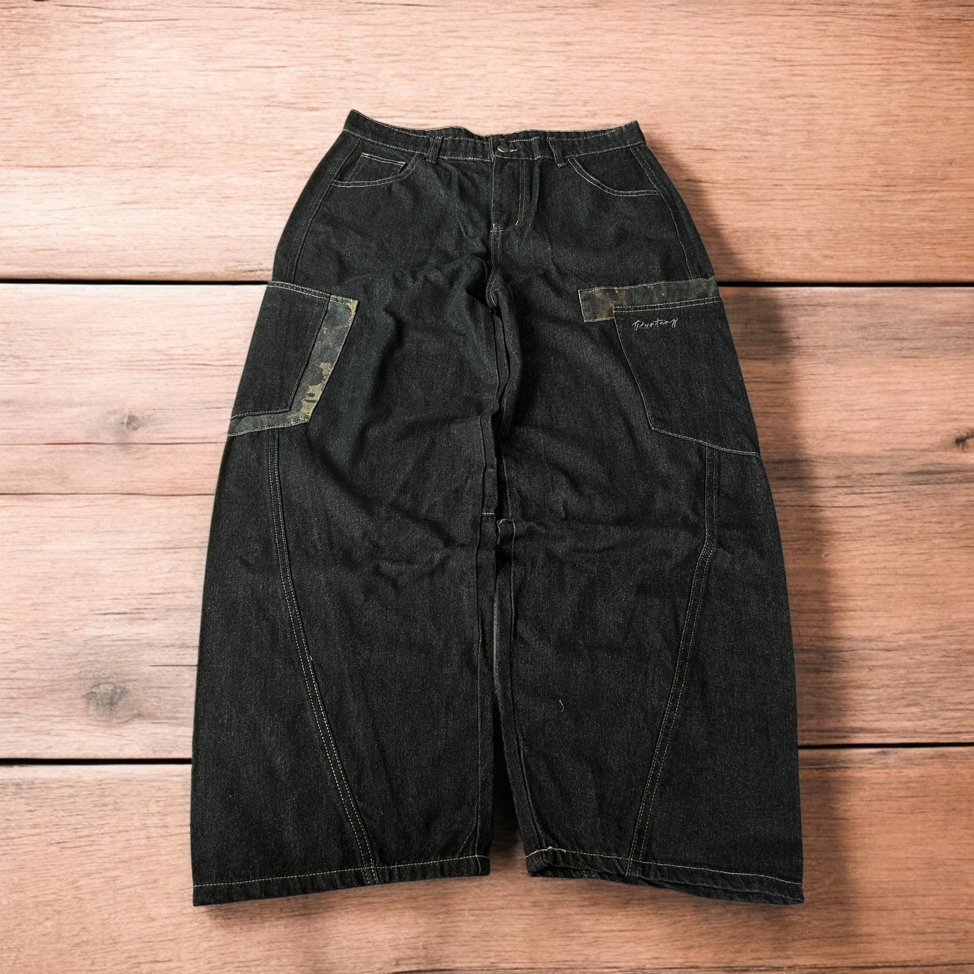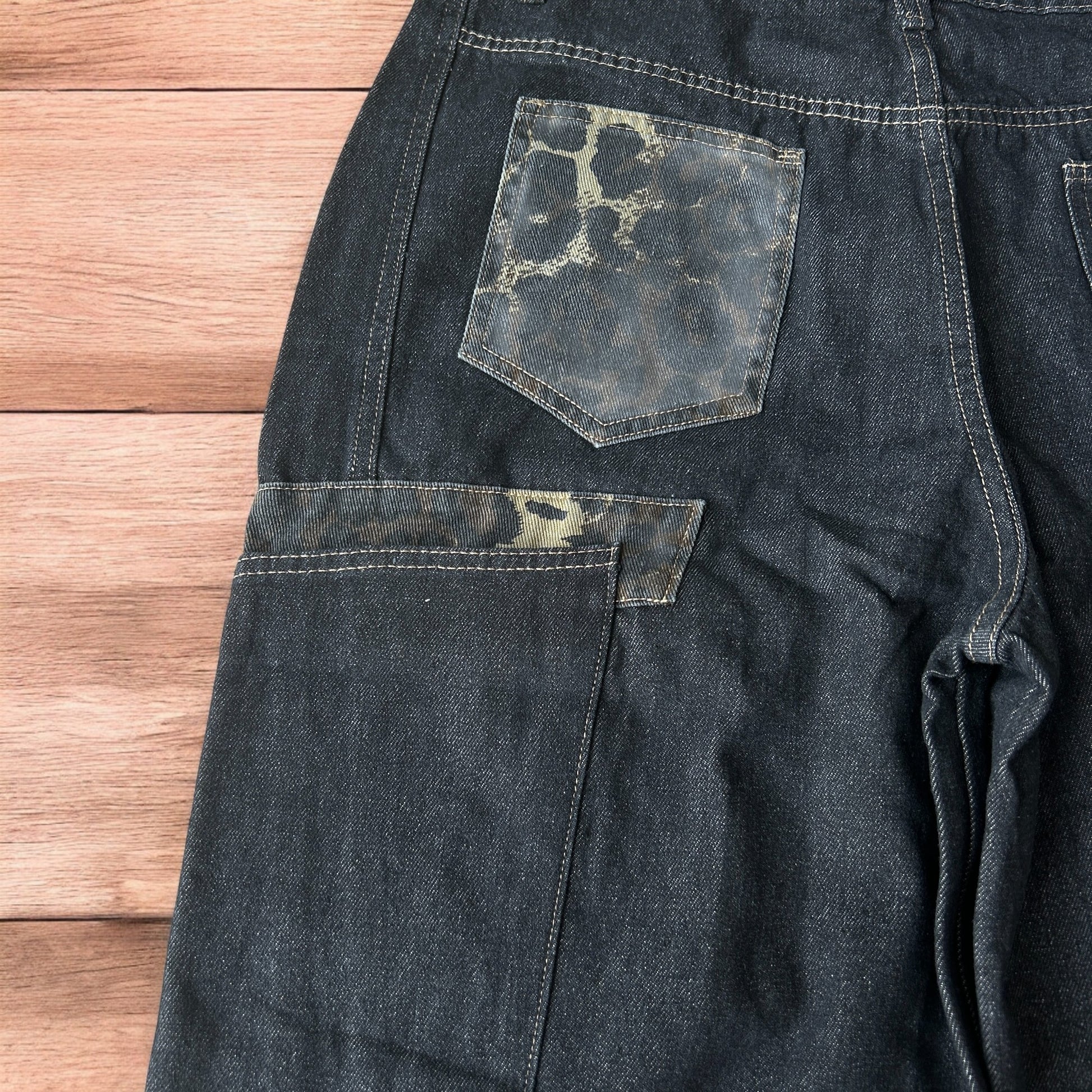 Incredible vintage style baggy wide leg skater fit jeans with leopard print in dark blue.