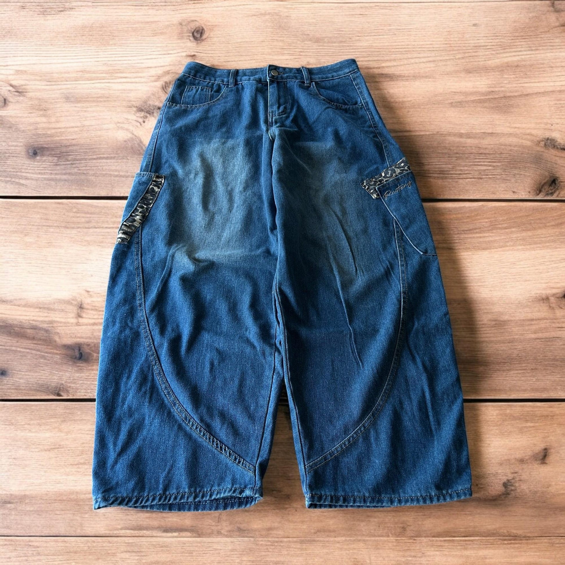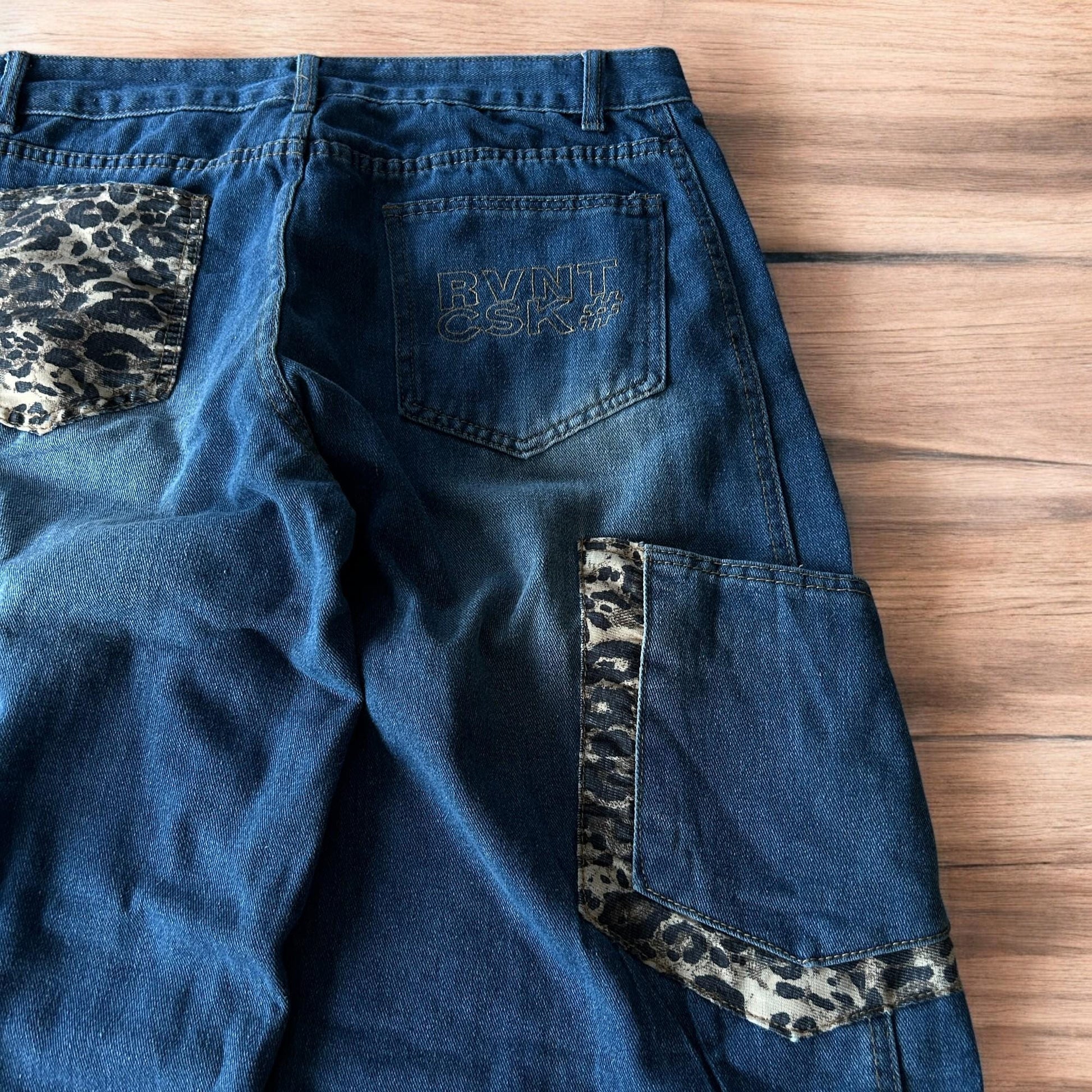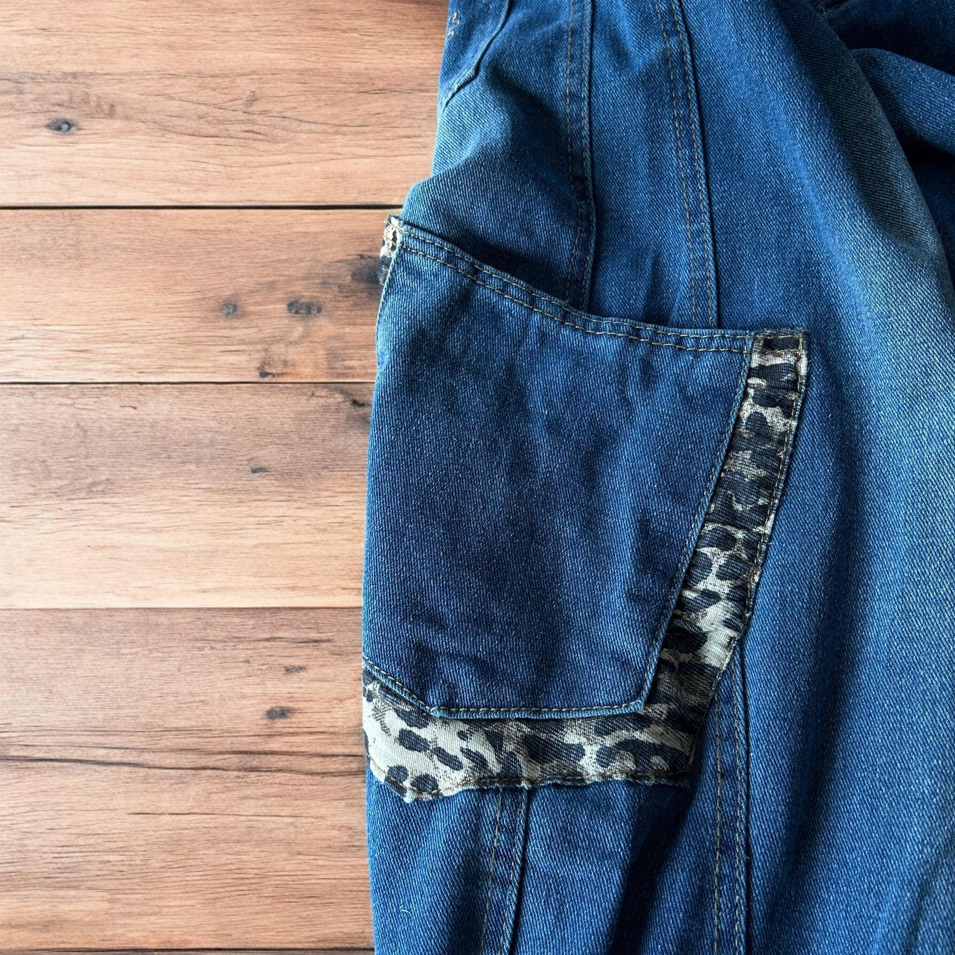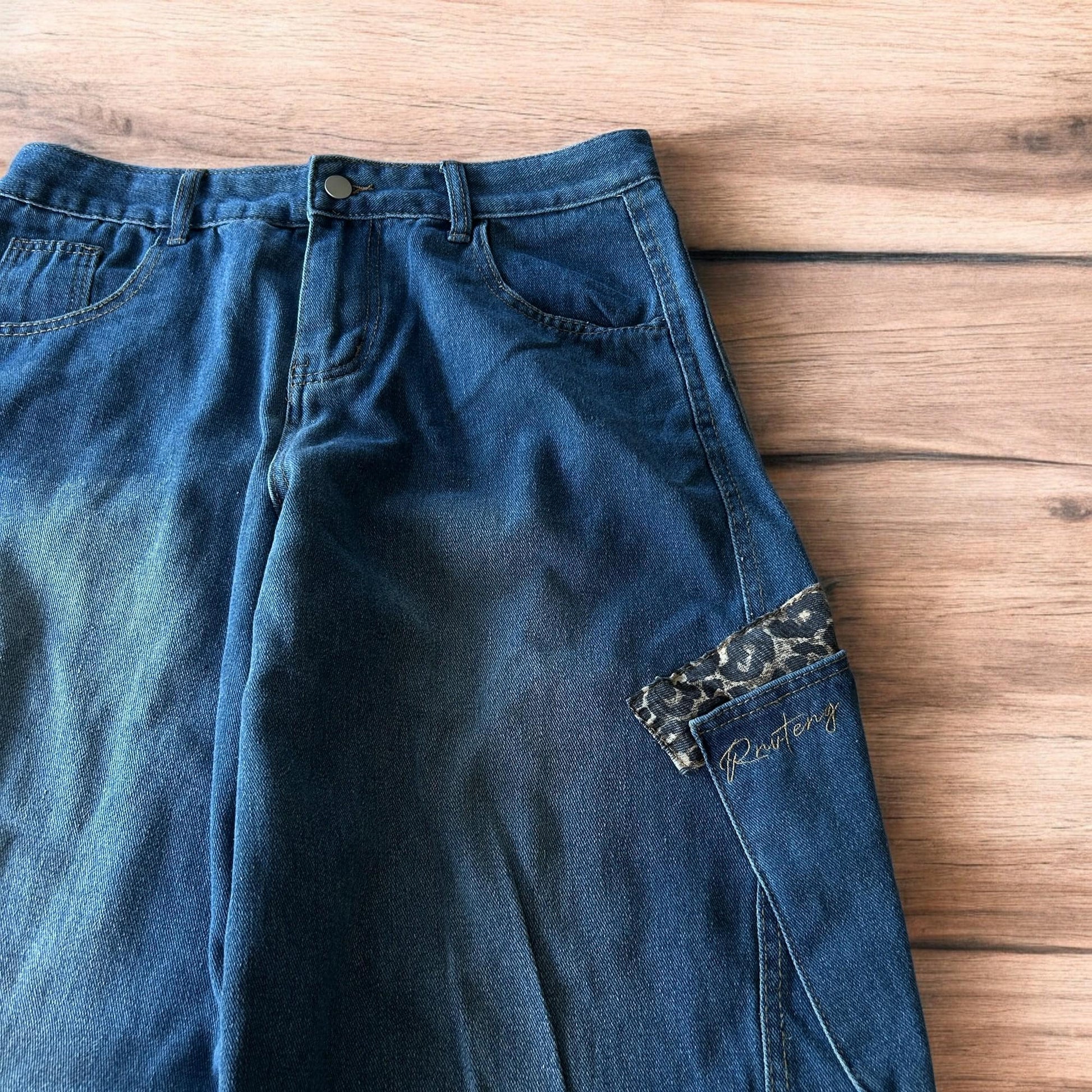 Incredible vintage style baggy wide leg skater fit jeans with leopard print in mid blue.