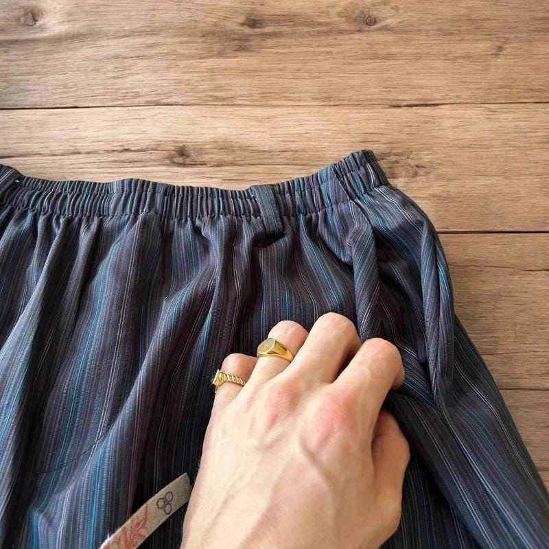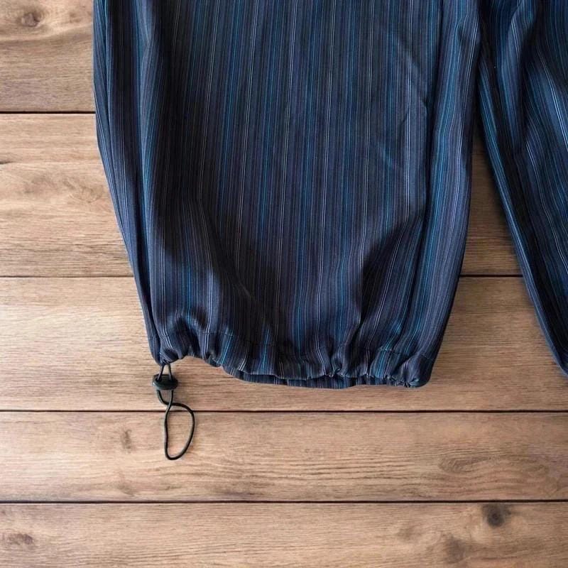 Great condition. Wide leg. Korean Japanese vintage style. Drawstring waist and ankles with pockets. Silky lightweight material. Black brown blue stripes.
