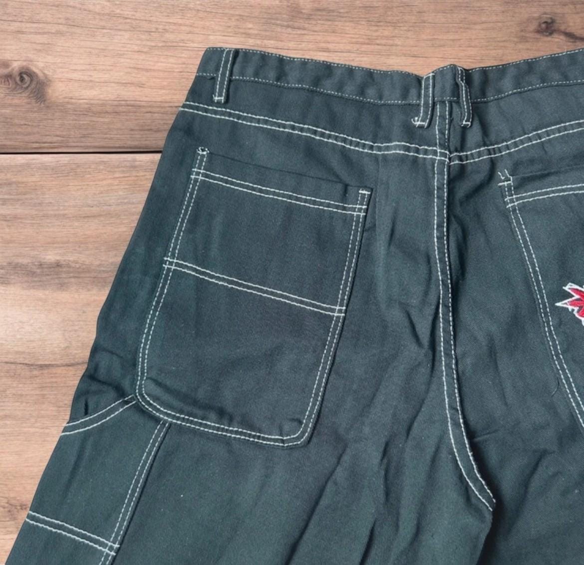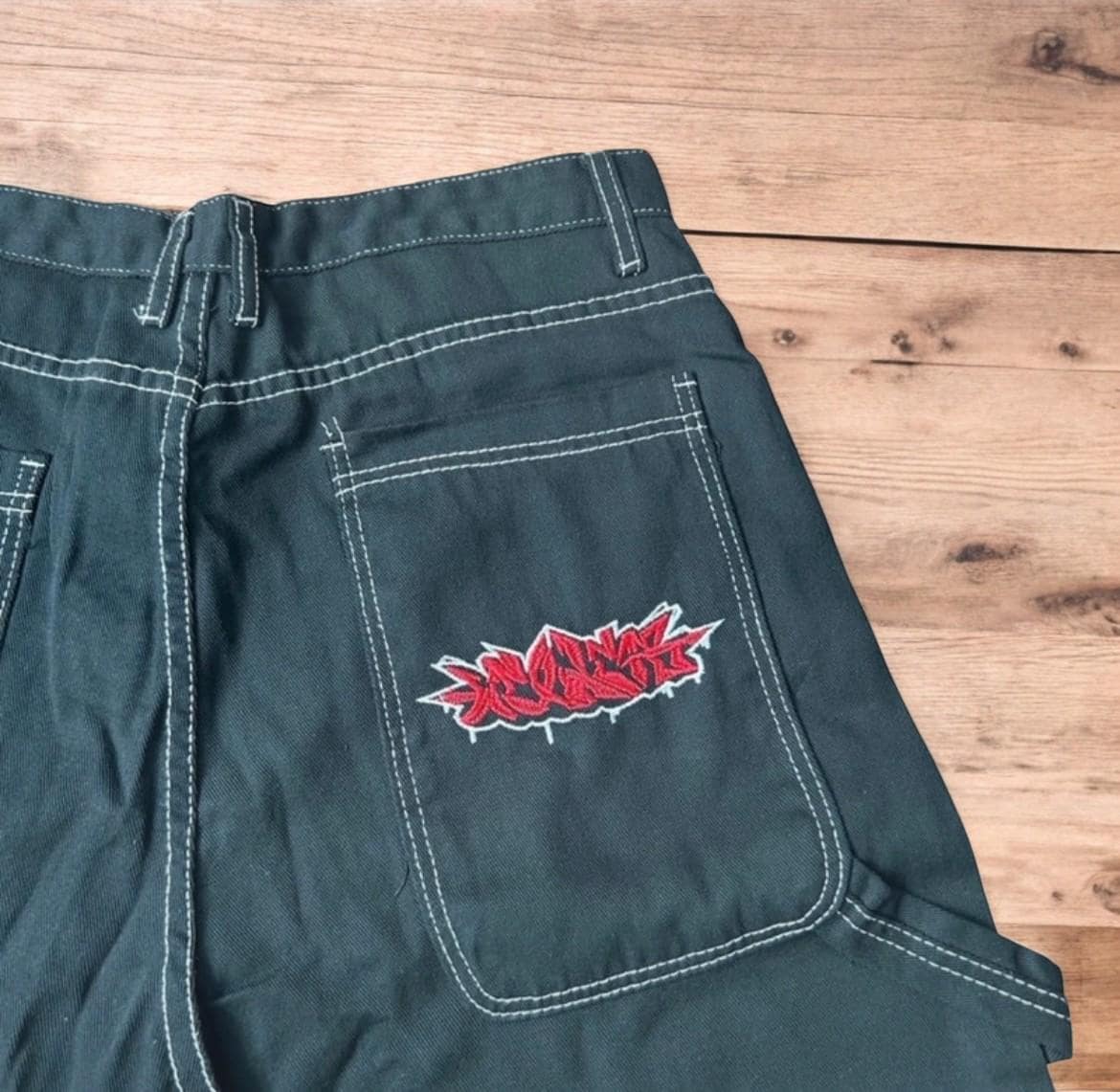 Great used condition. Lightweight material. Embroidered design in red. Super baggy long skater fit. Contrast stitch.