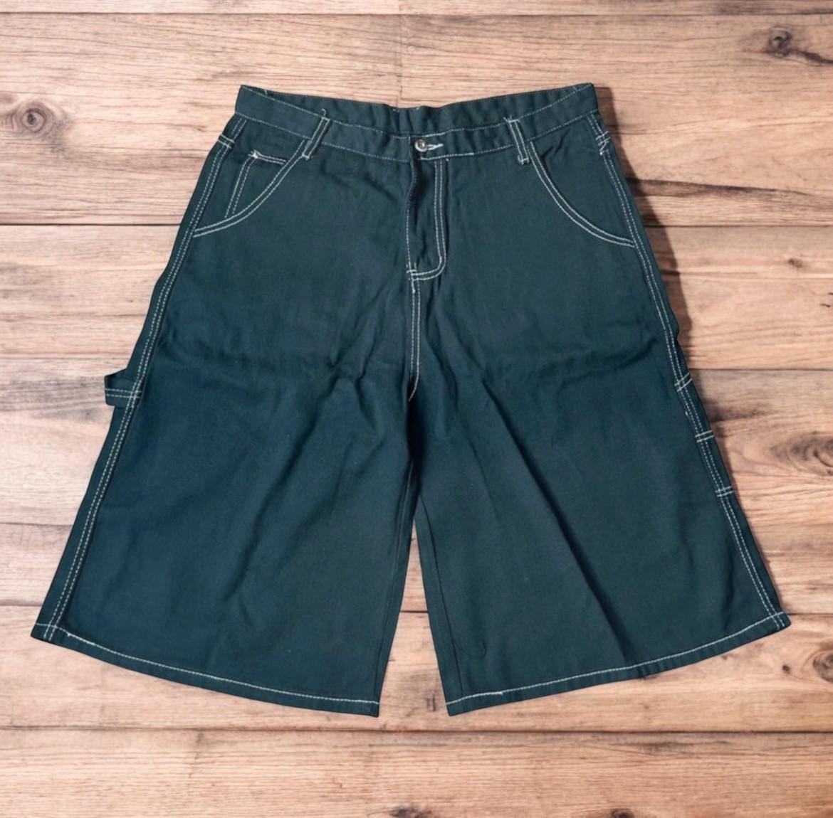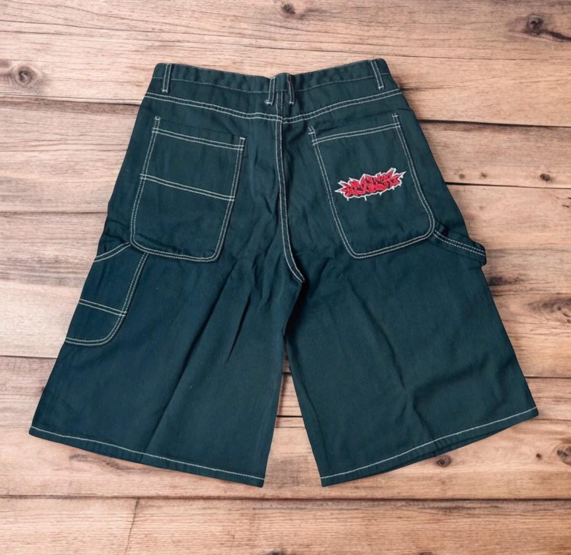 Insane super baggy long skater jean shorts jorts in black with embroidered design.