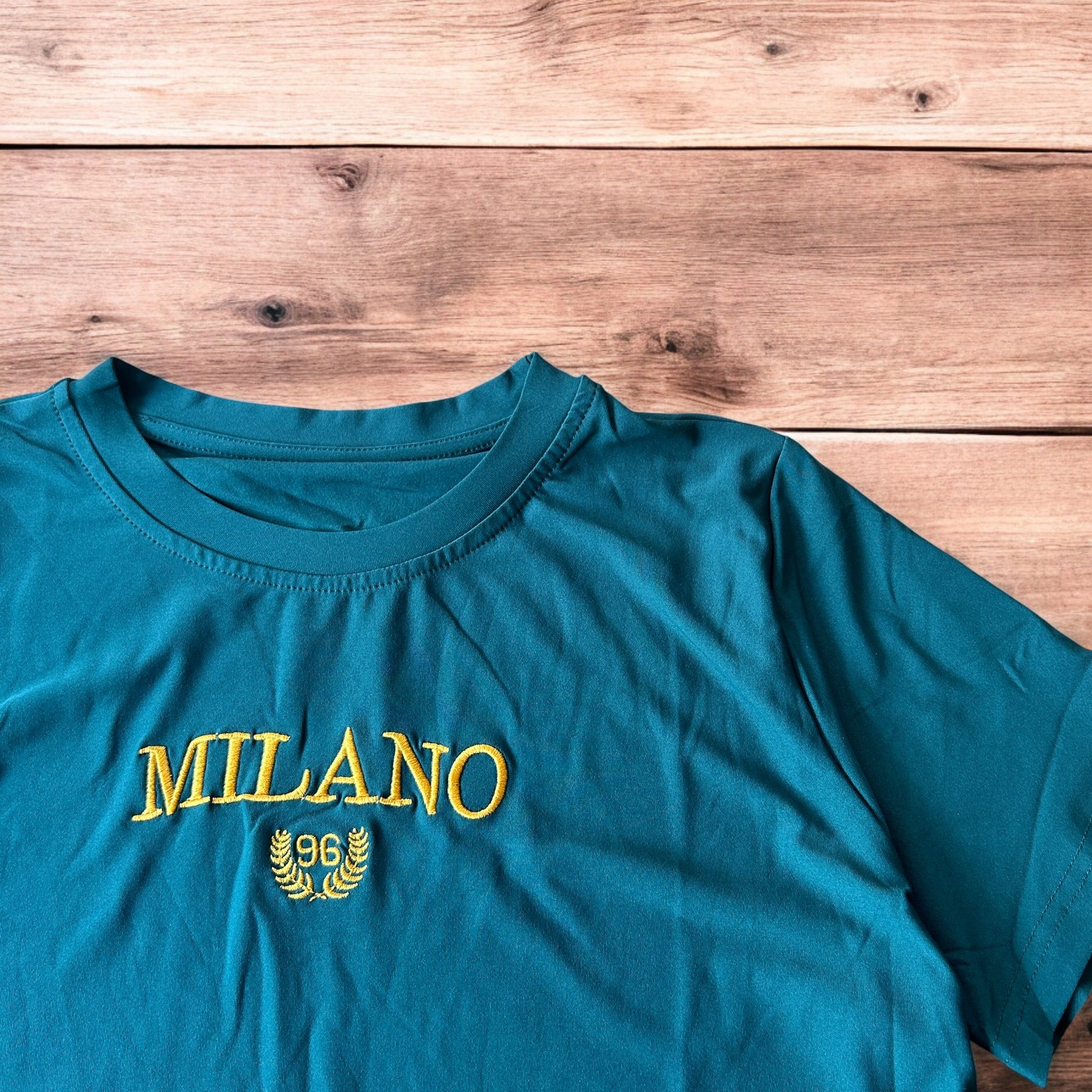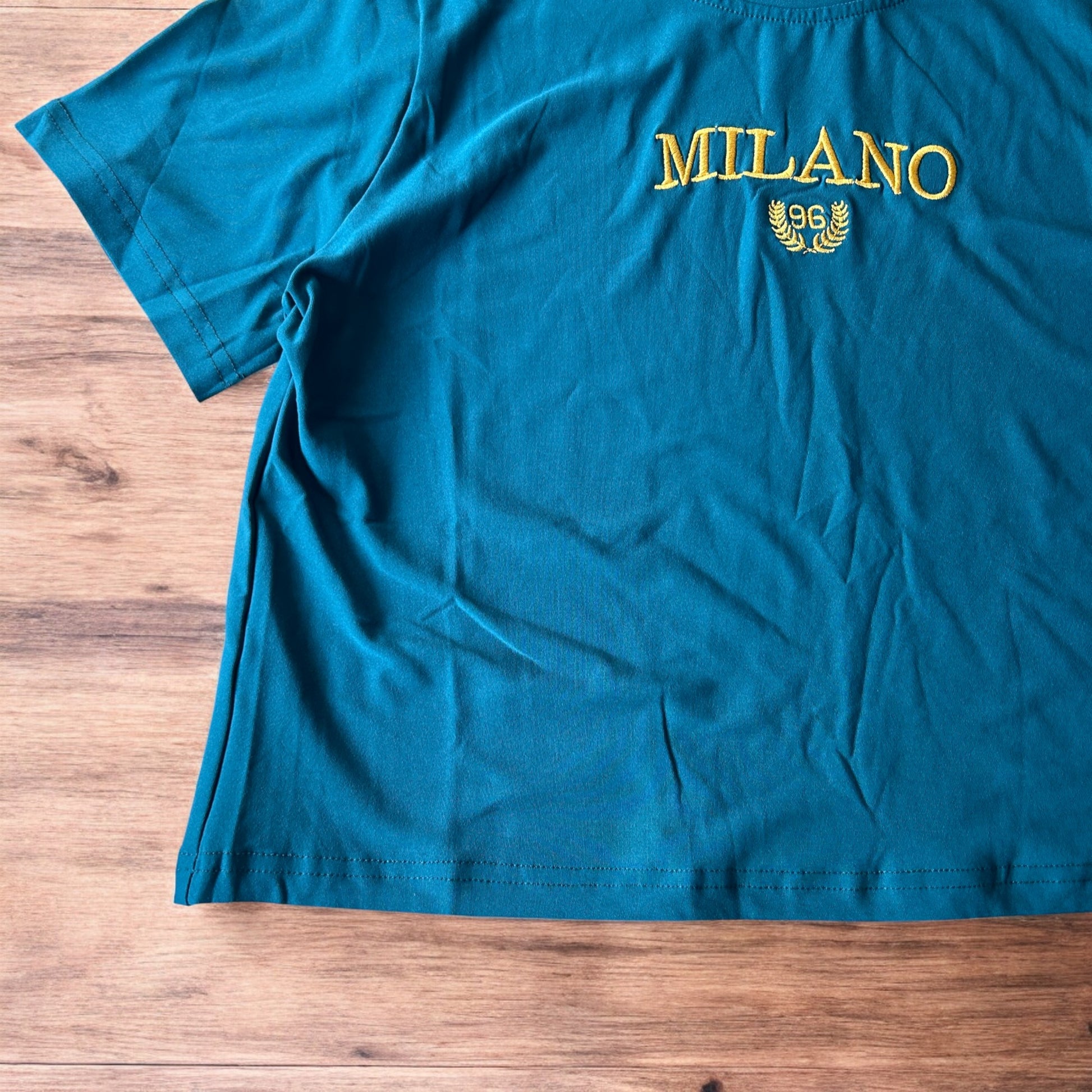 Lovely Milano top T-shirt in cyan blue with gold embroidery.