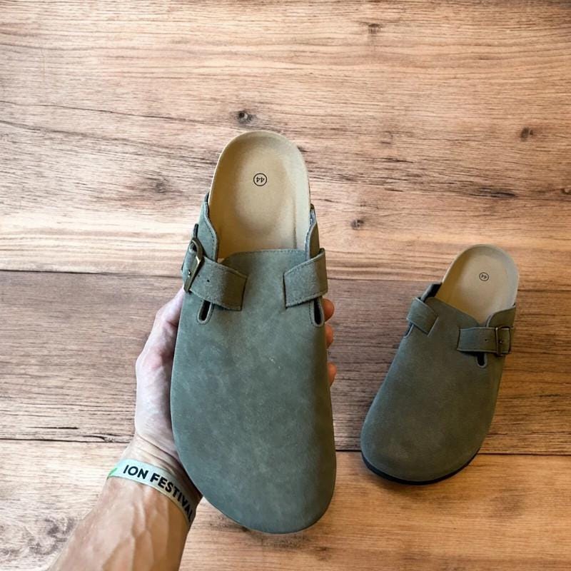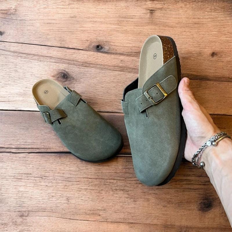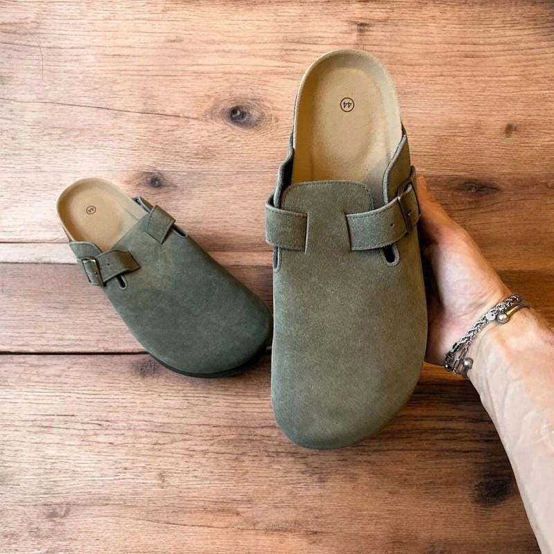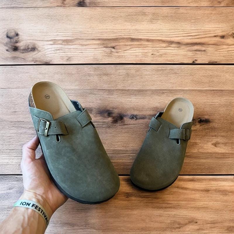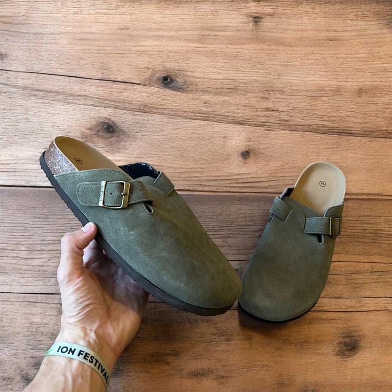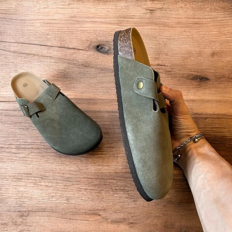 Lovely suede mules sandals in khaki green.