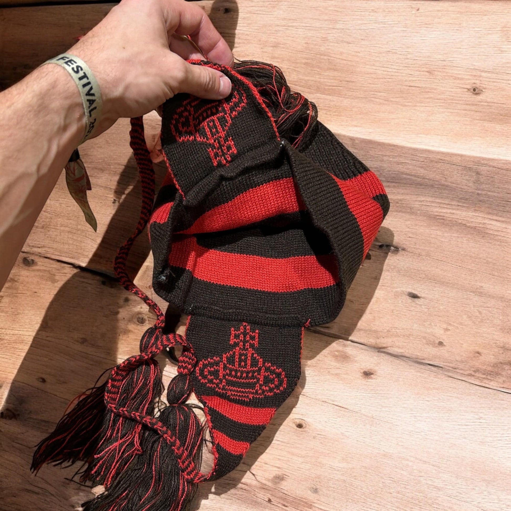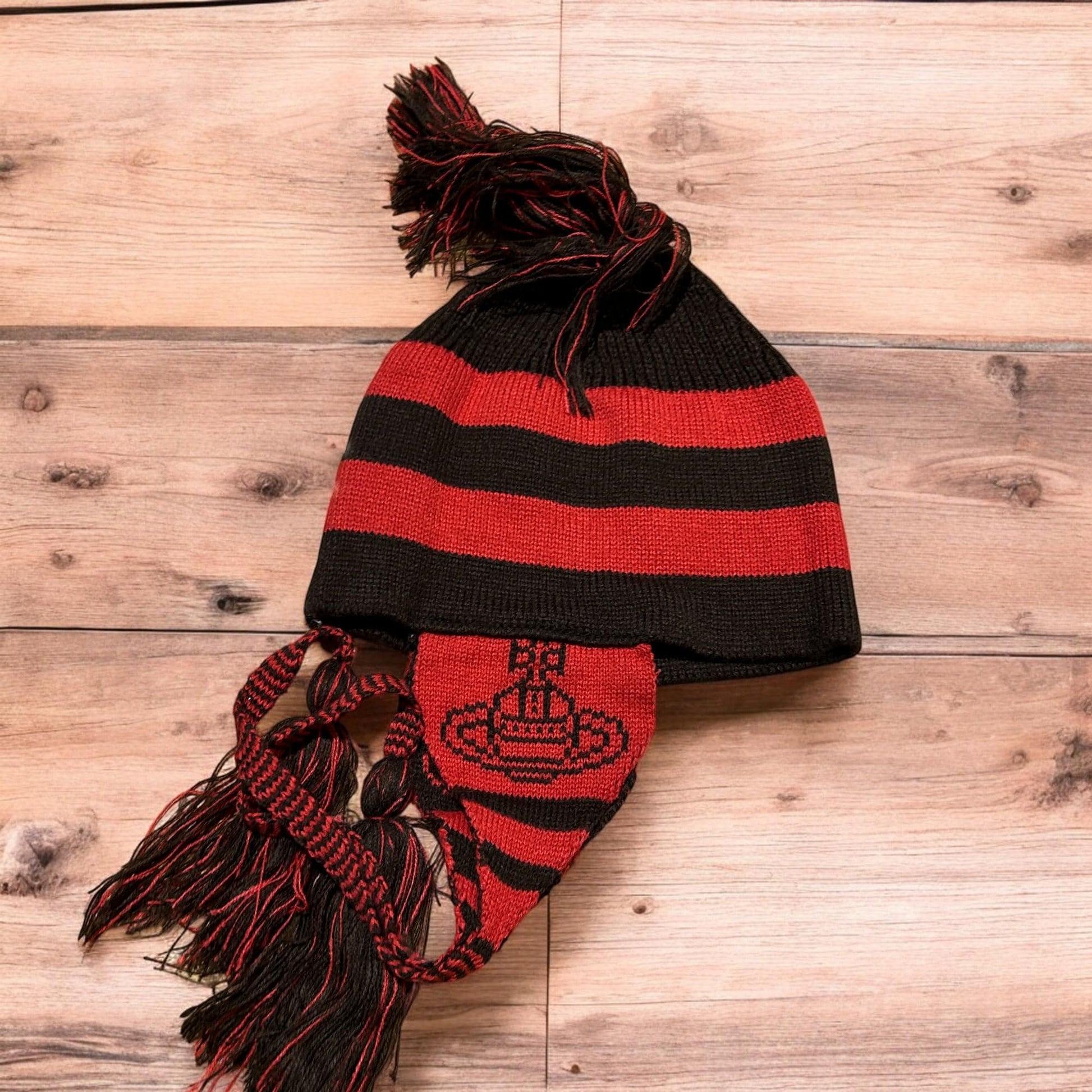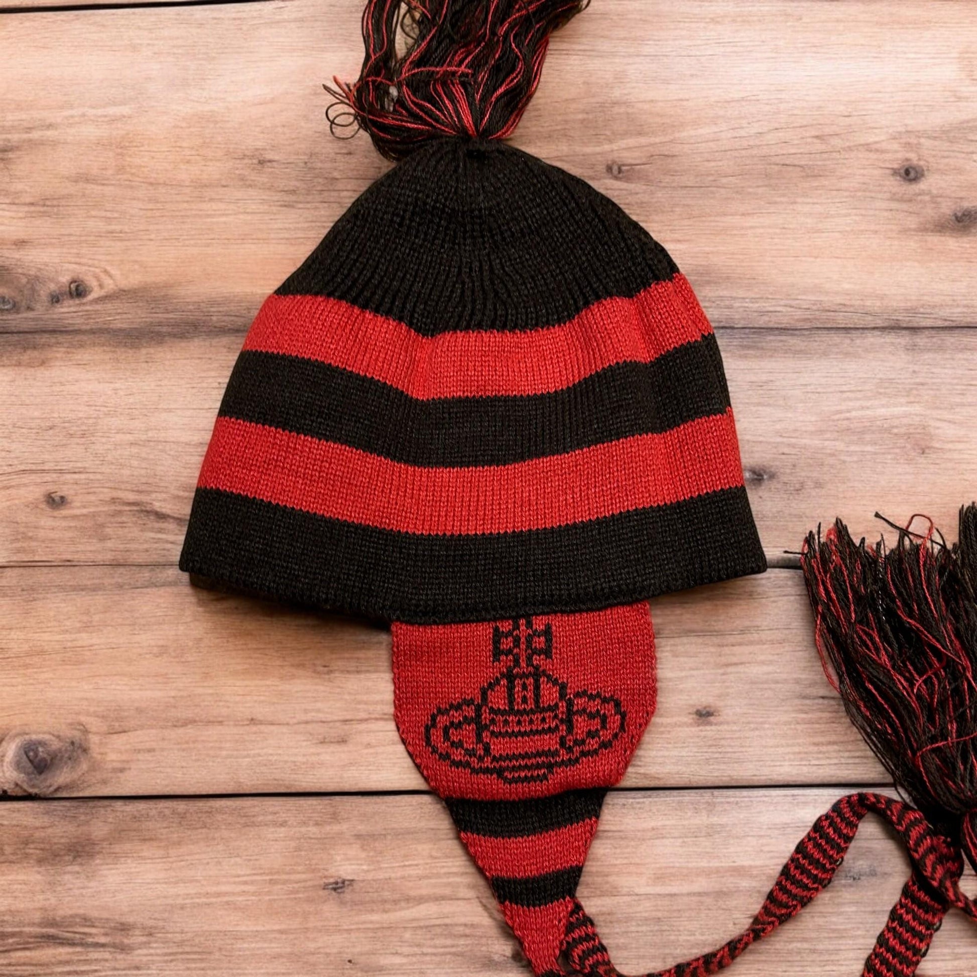 Lovely vintage style Dappy ear flap bobble hat in black/red stripes. One size.