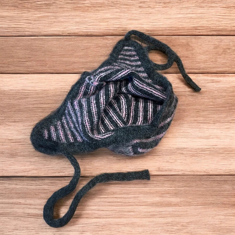 Lovely vintage style knitted ear flap hat bonnet in pink/grey stripes. One size.