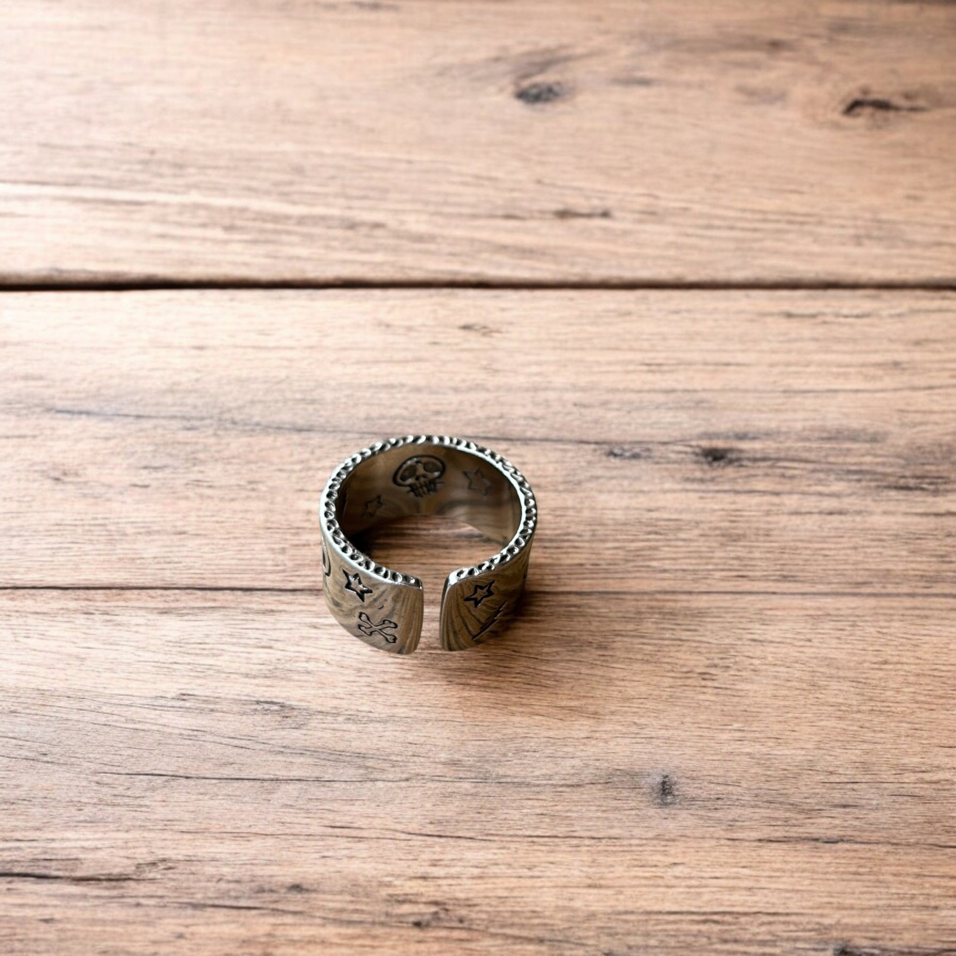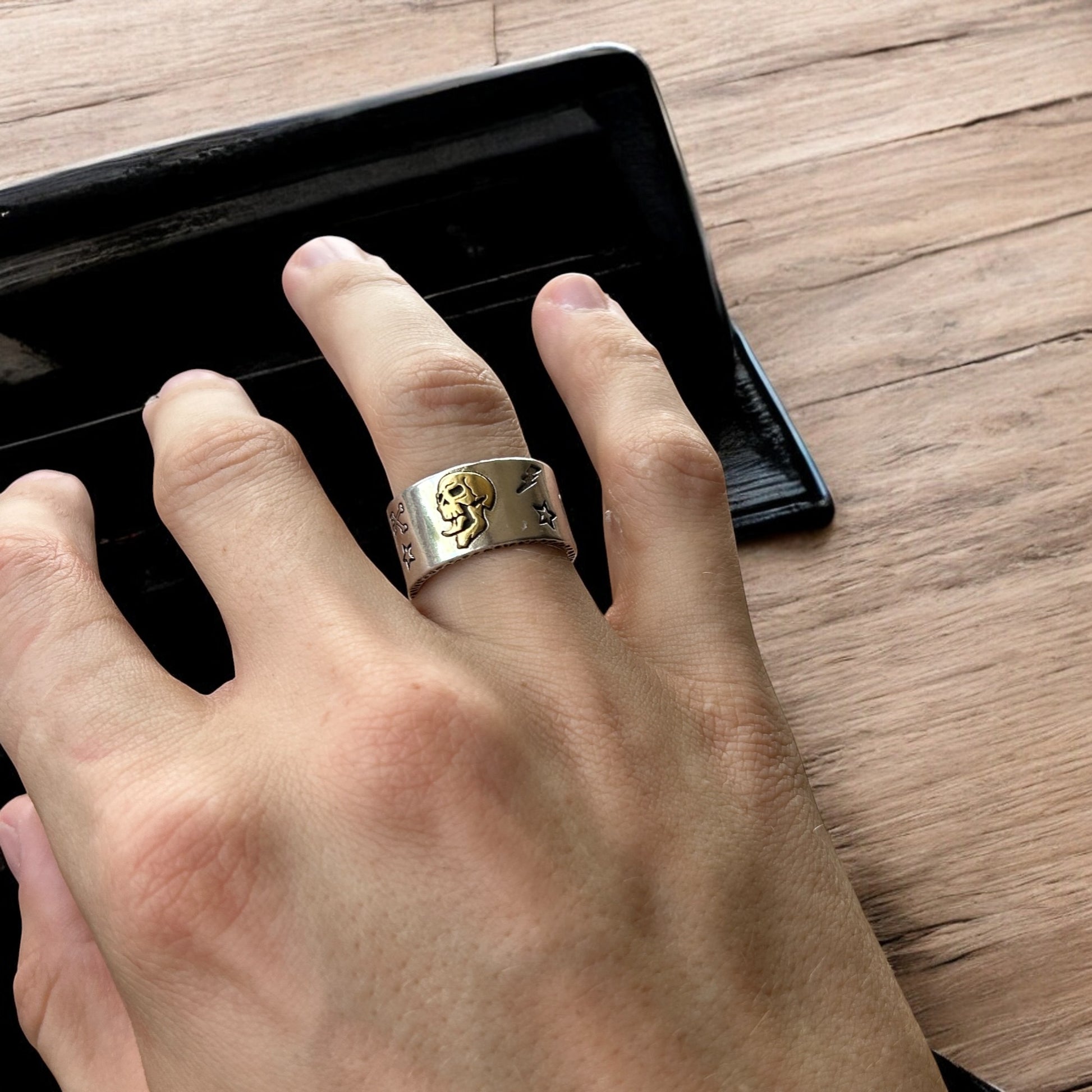 Lovely vintage style stainless steel gothic skater skull ring in silver with gold accent. One size.