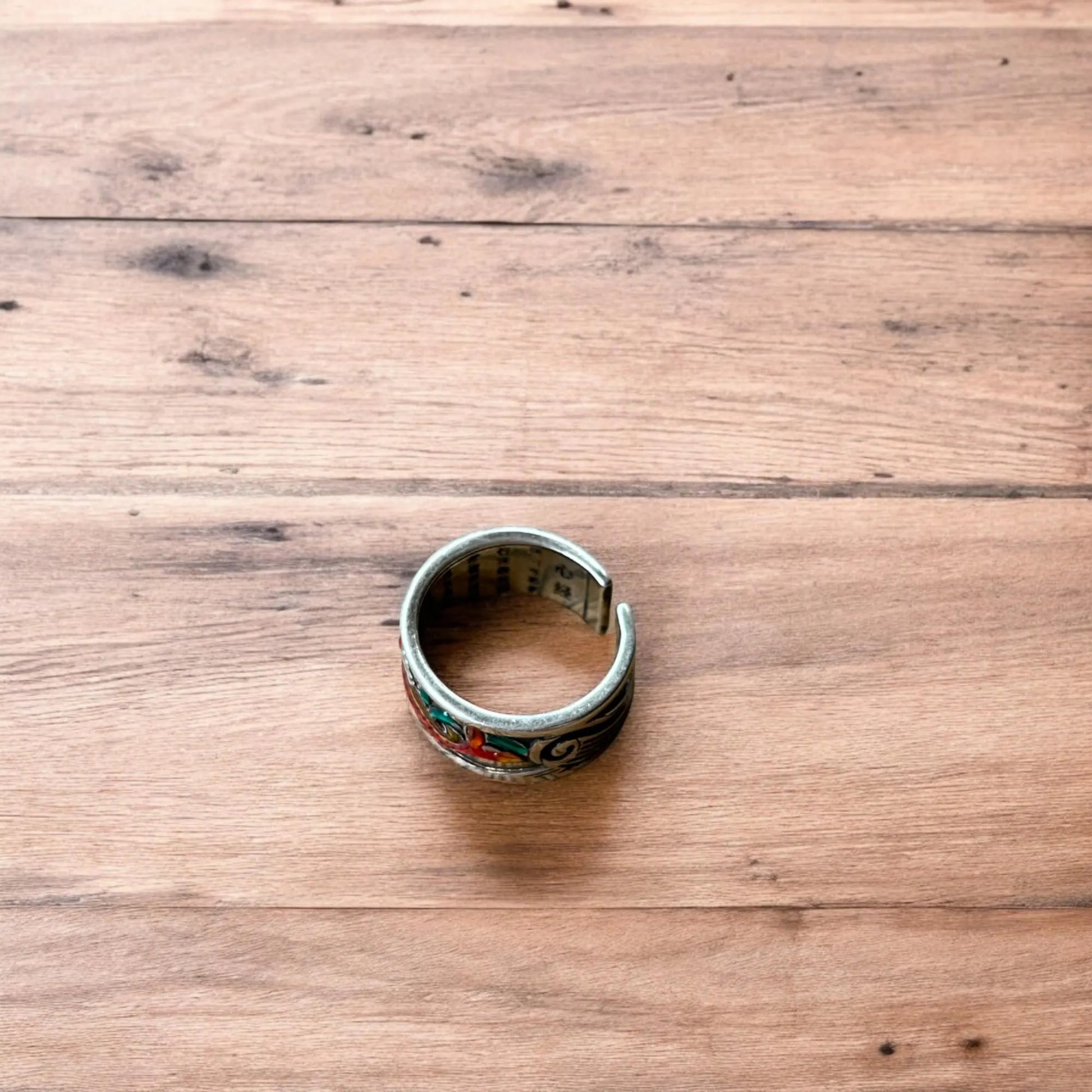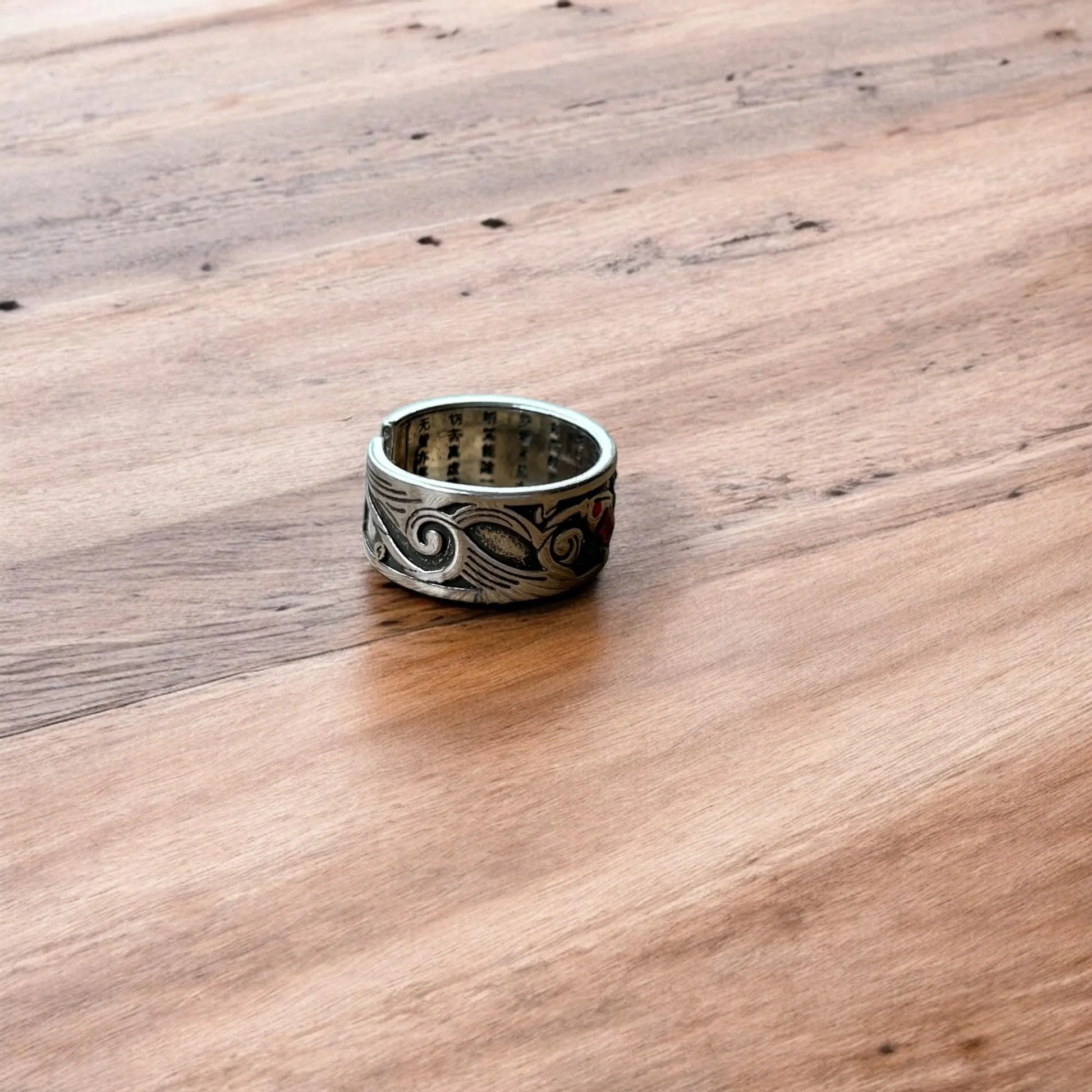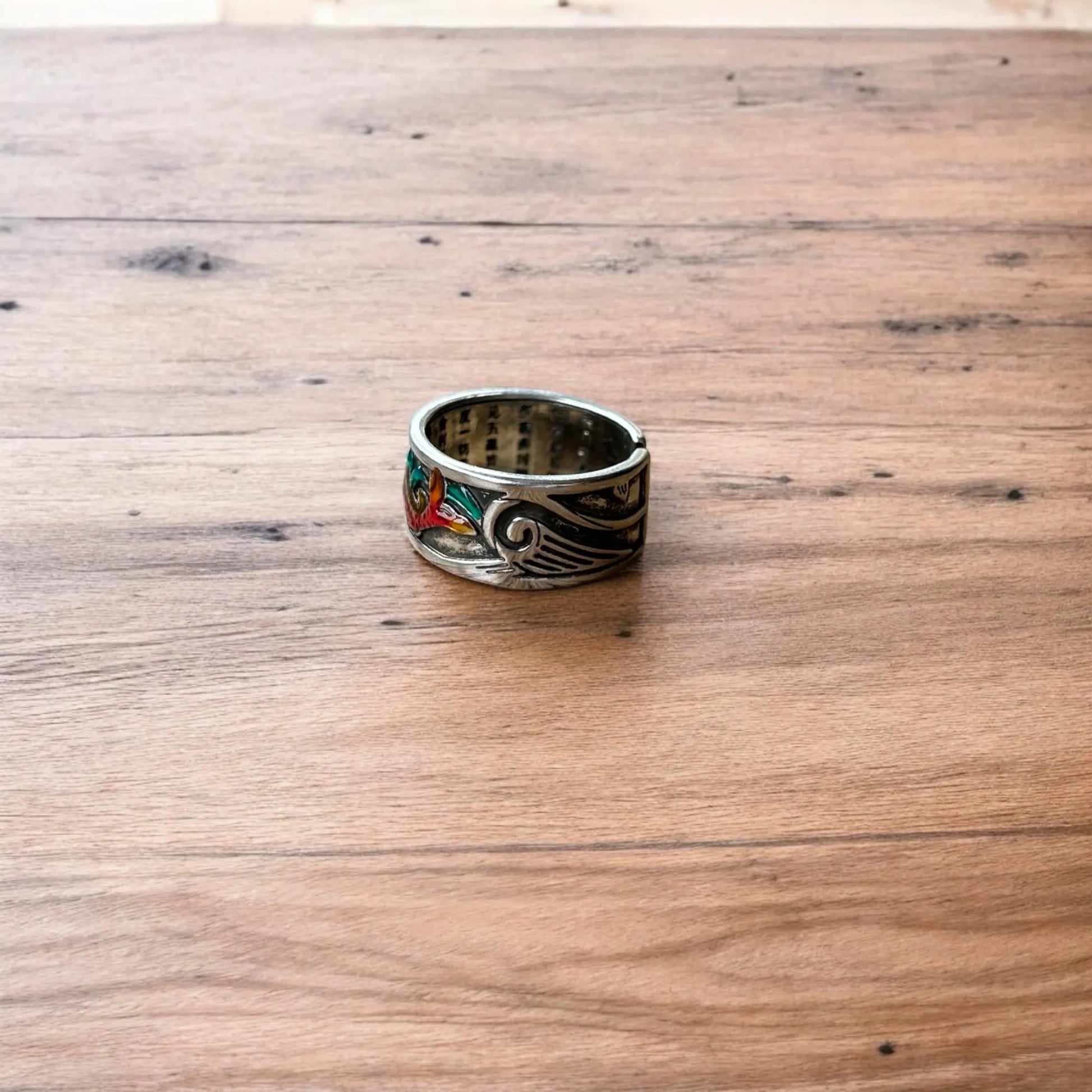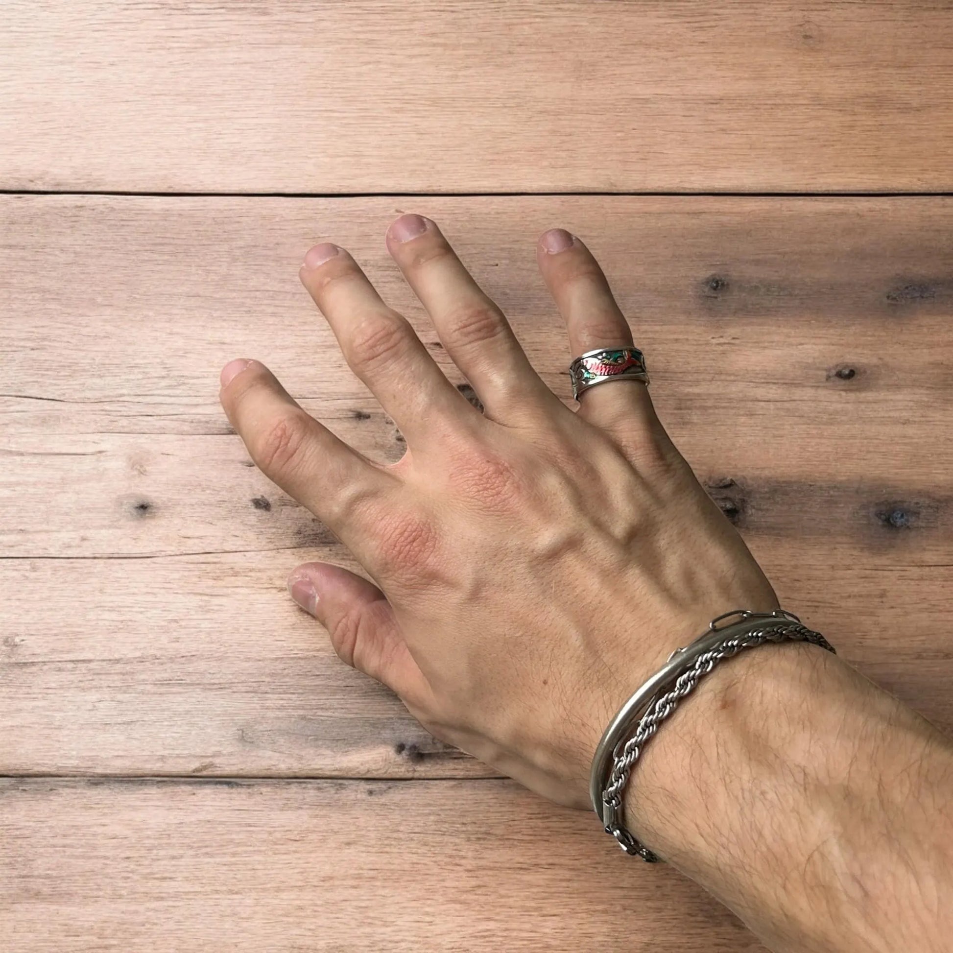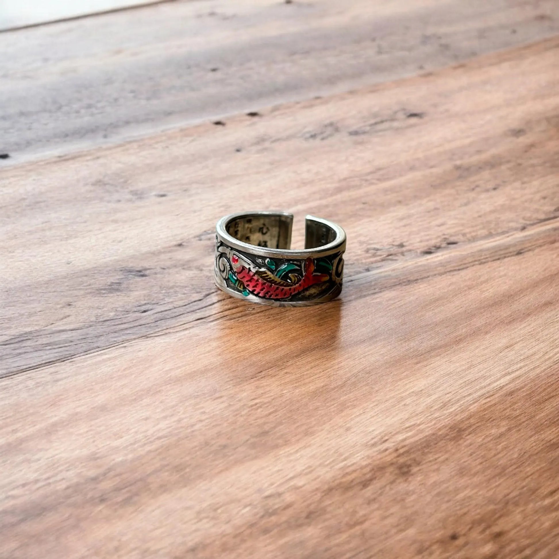 Great condition. Red silver and green design. Boho Japanese oriental style. Strong resistant stainless steel material. Unisex. Fish eye. Inscription inside. Fully adjustable - can be resized