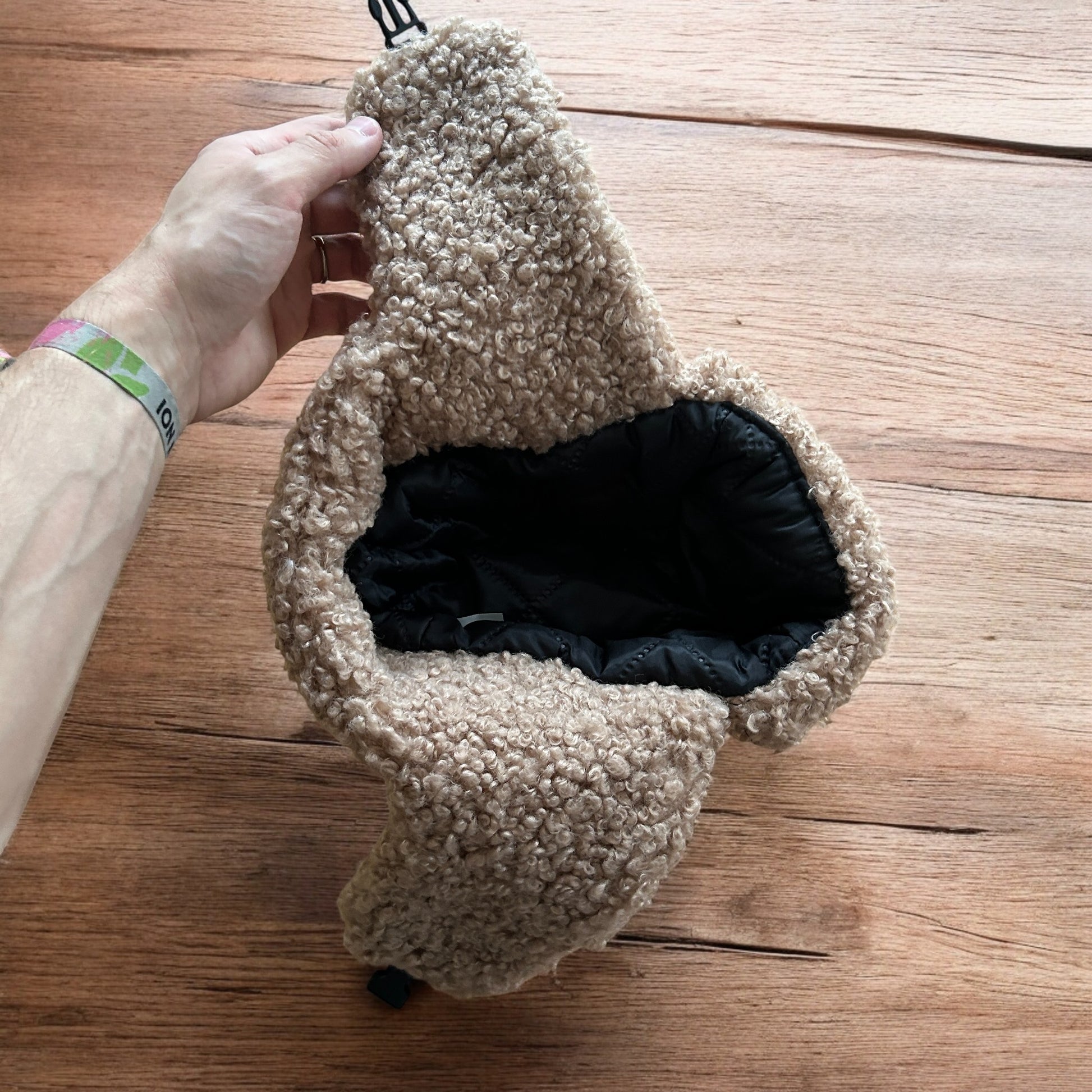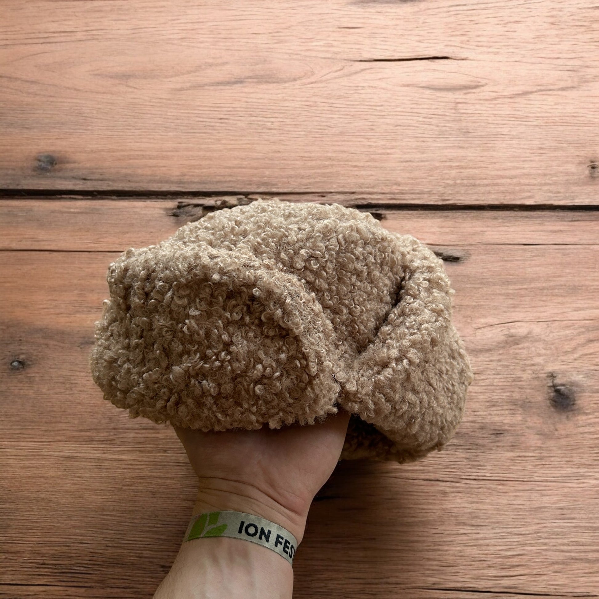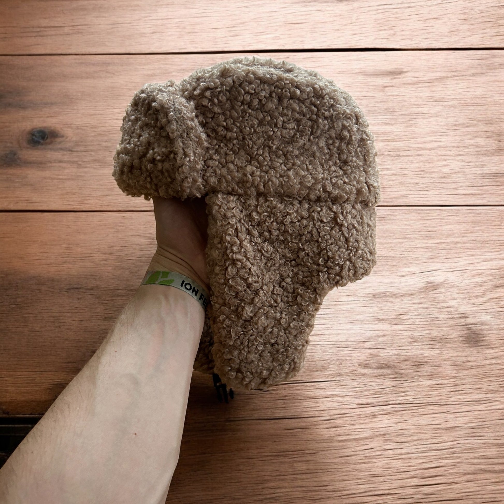The BEST hat ive found to date! Great condition. Super warm and comfy ear flap winter hat. Can be styled up or down. Clips to secure in place. Unisex. High quality material. Trapper hat. Fluffy sheep wool style outer with lined inner. Korean Japanese vintage style. Fits 54cm - 60cm head