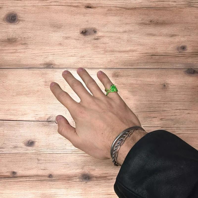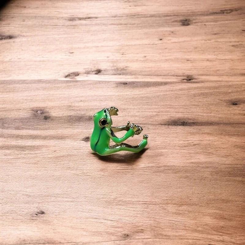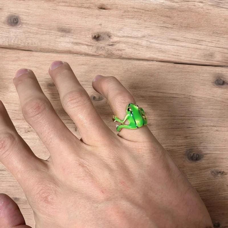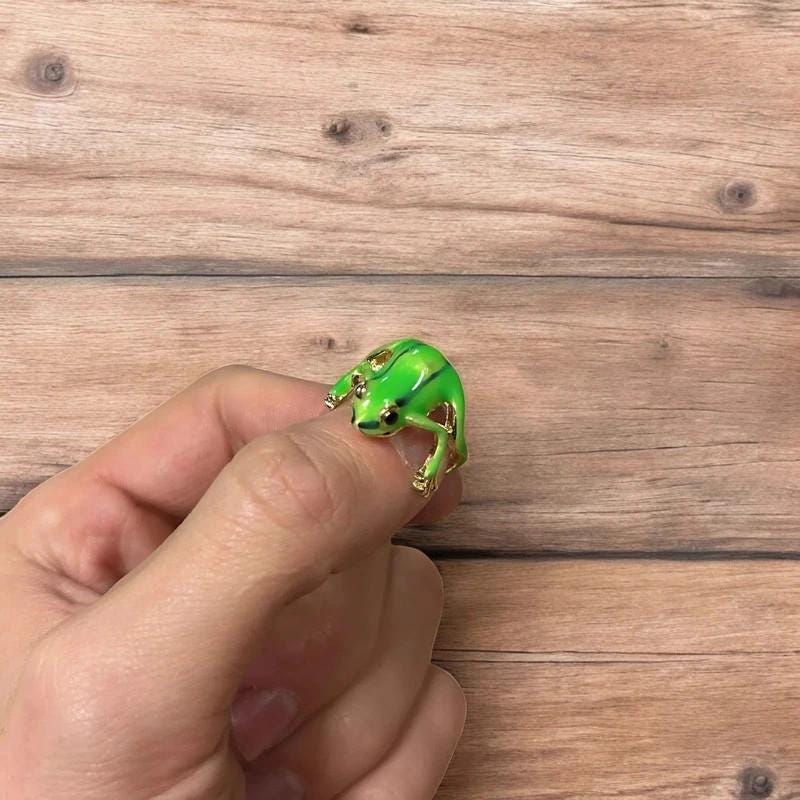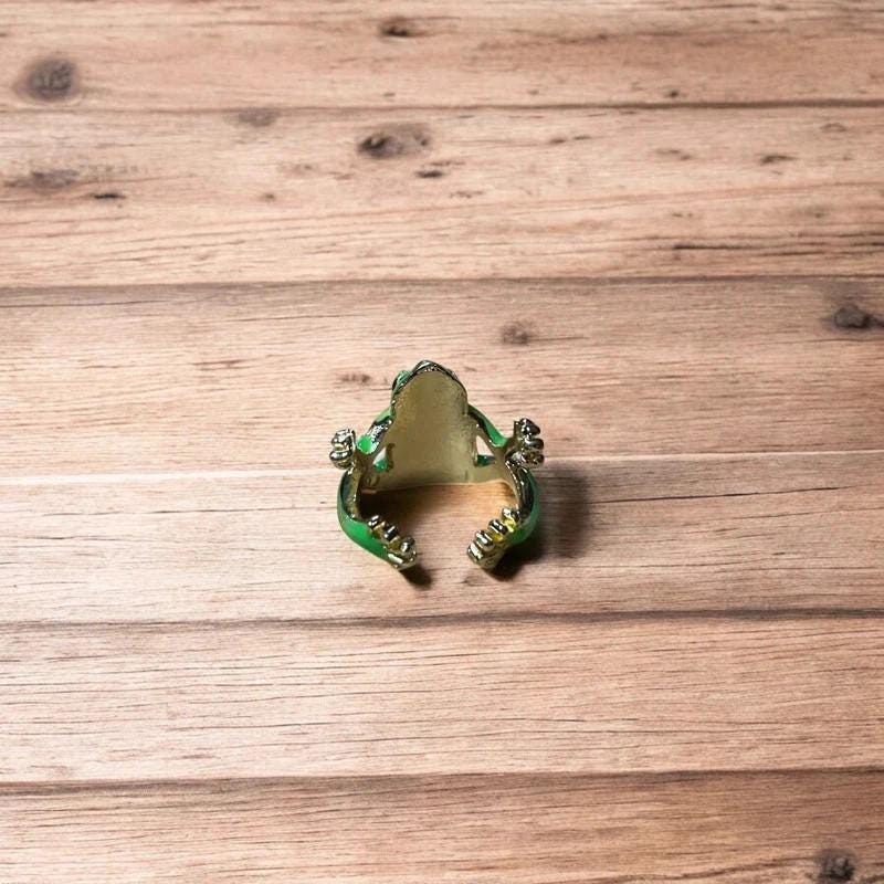 Great condition. Very life like green frog with silver detailing. Fully adjustable to any size finger. Enamel material. Unisex.