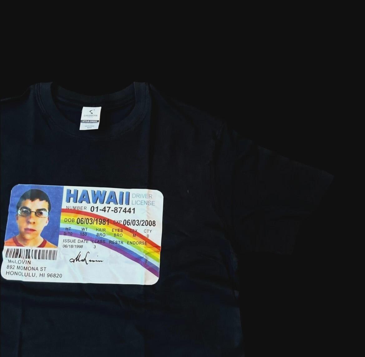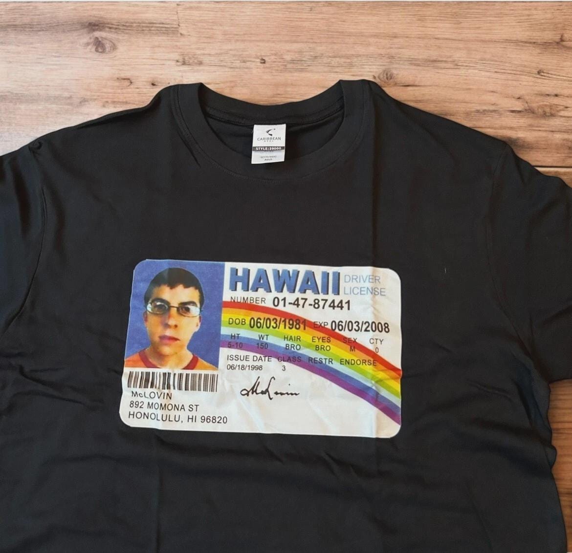 Great used condition. Loose fit. Funny Hawaii ID Superbad Mclovin print on front. Ideal for summer festivals and holidays. Also have in white.