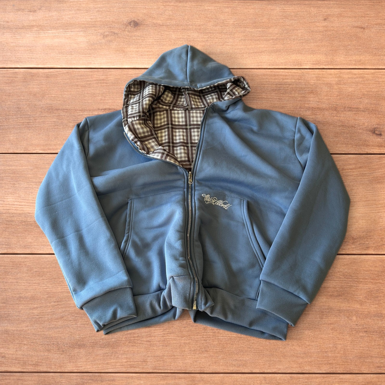 Oversized baggy reversible zip up hoodie jumper in checkered navy blue
