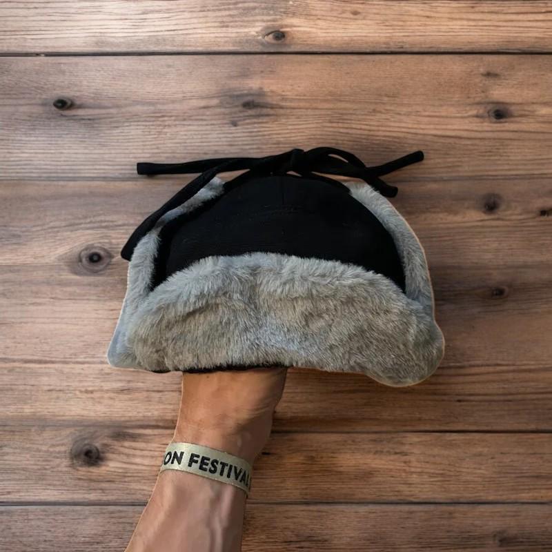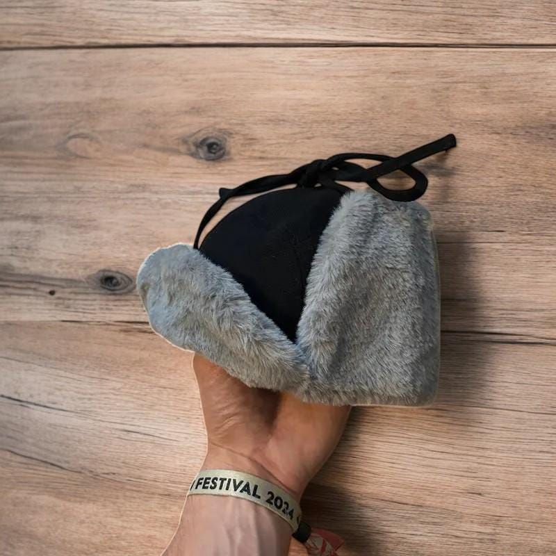 Russian ushanka trapper ear flap winter hat in black/grey colour way. 55-59cm