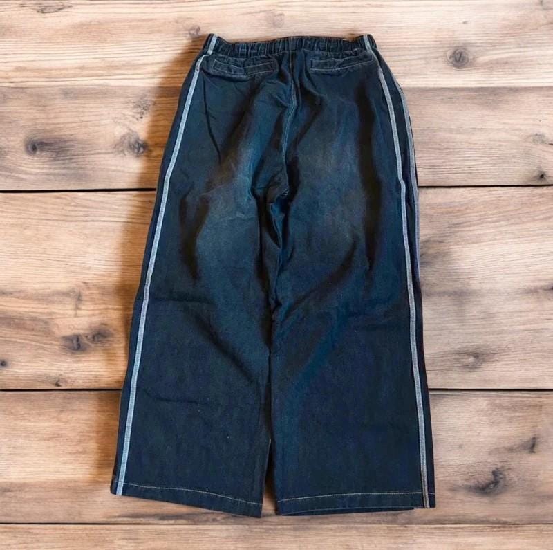Great condition. Wide leg. 3 side stripes. Carpenter strap. Korean Japanese vintage style. Elastic drawstring waist fits any size. high quality medium thickness rigid fit.