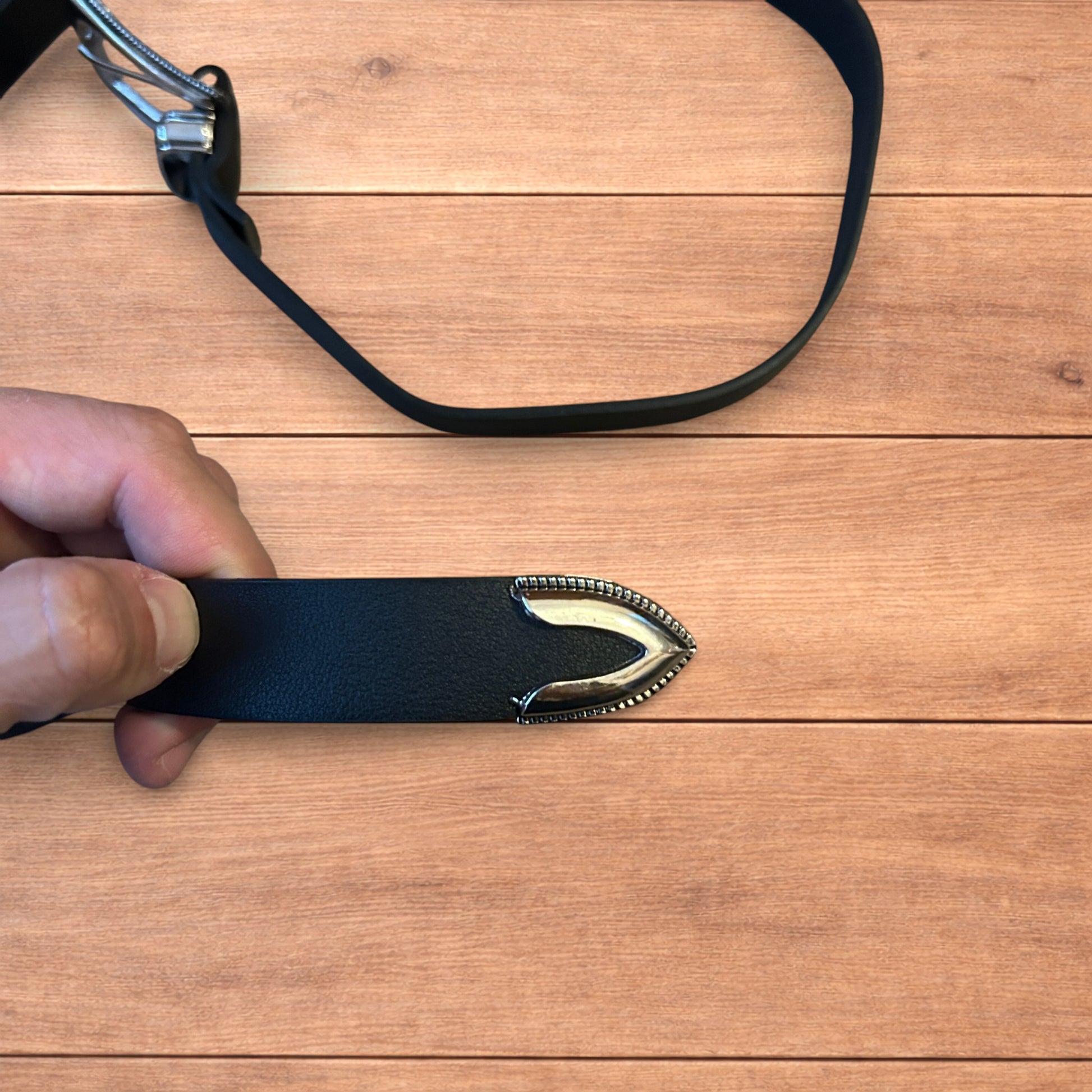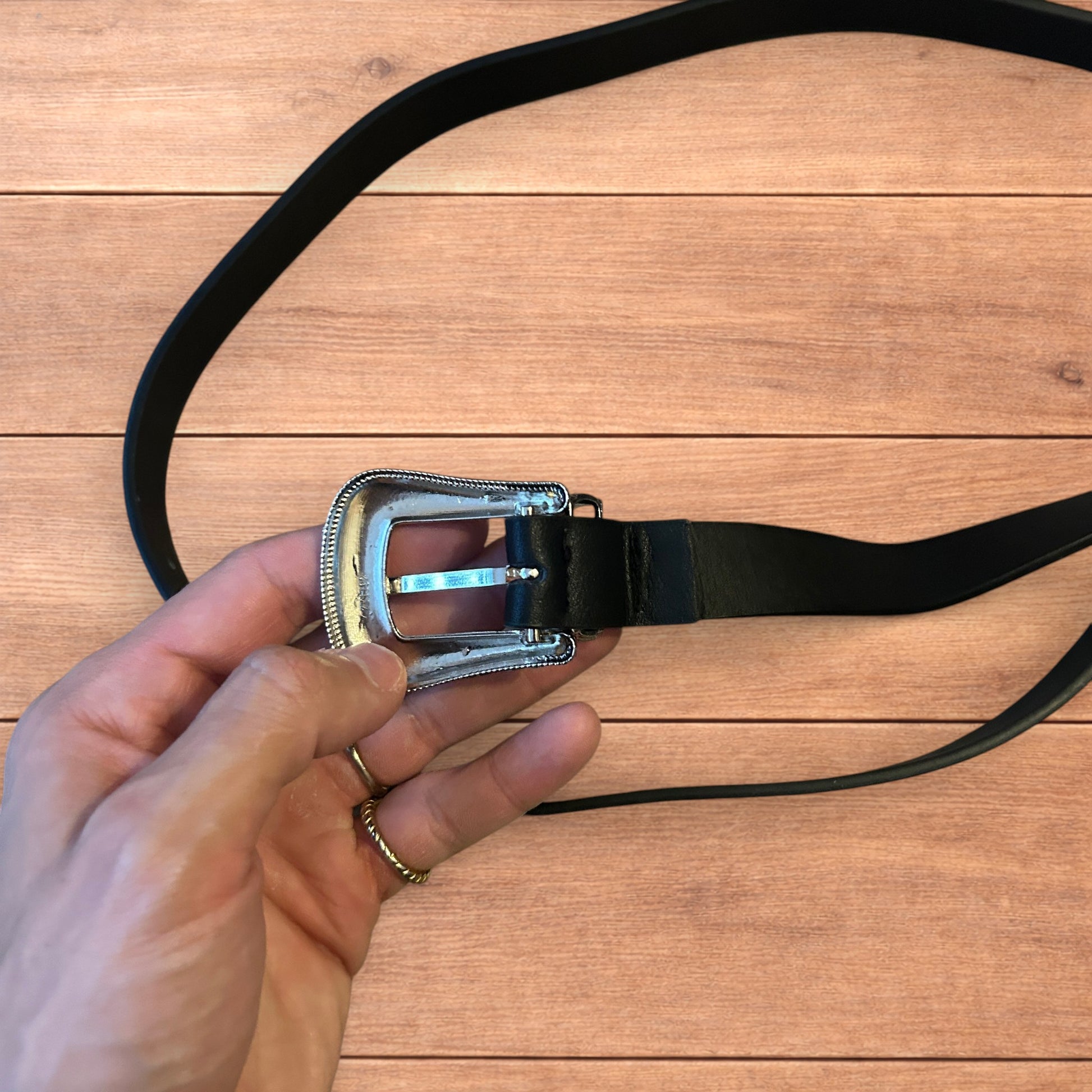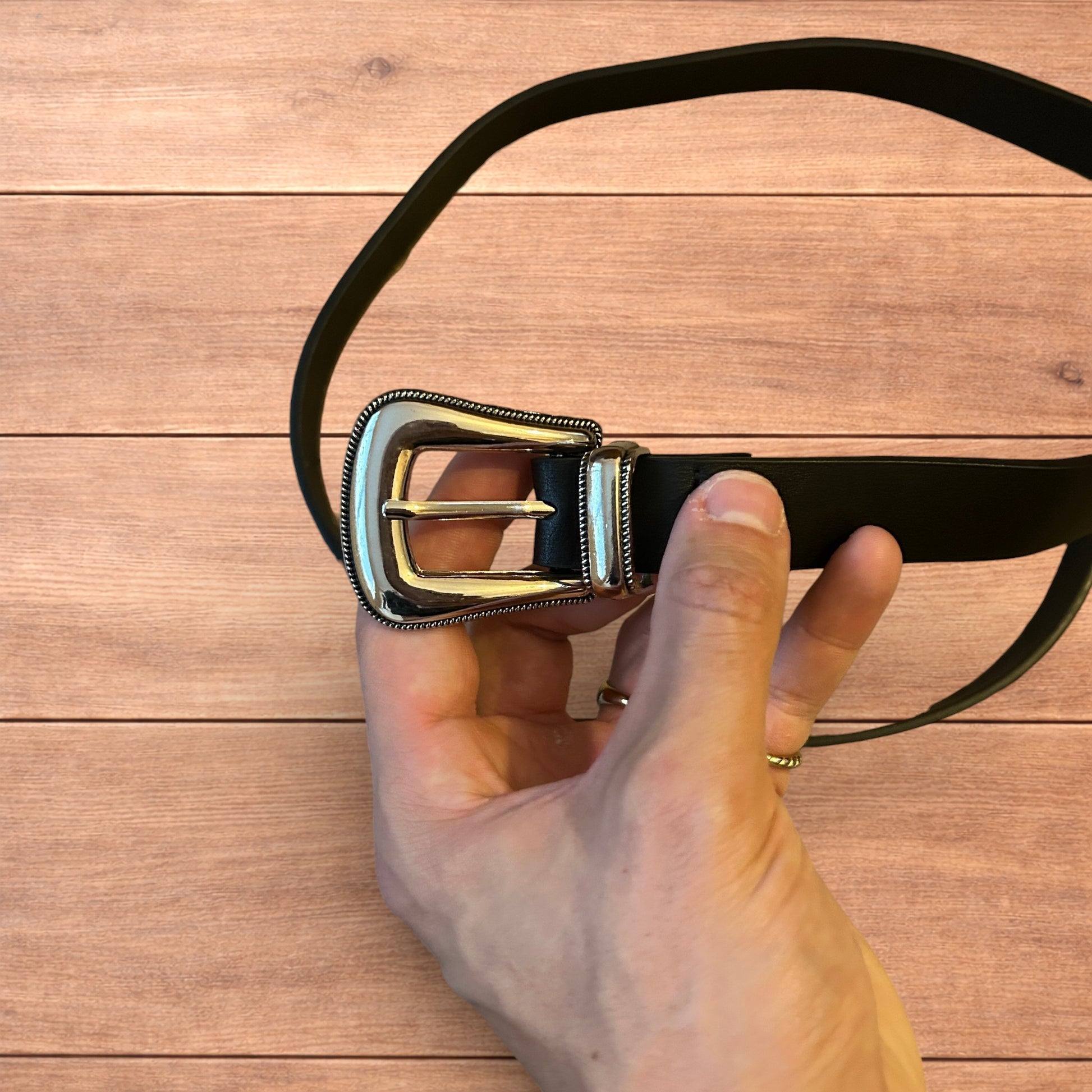 Vintage style faux leather western cowboy belt in black with silver trim.