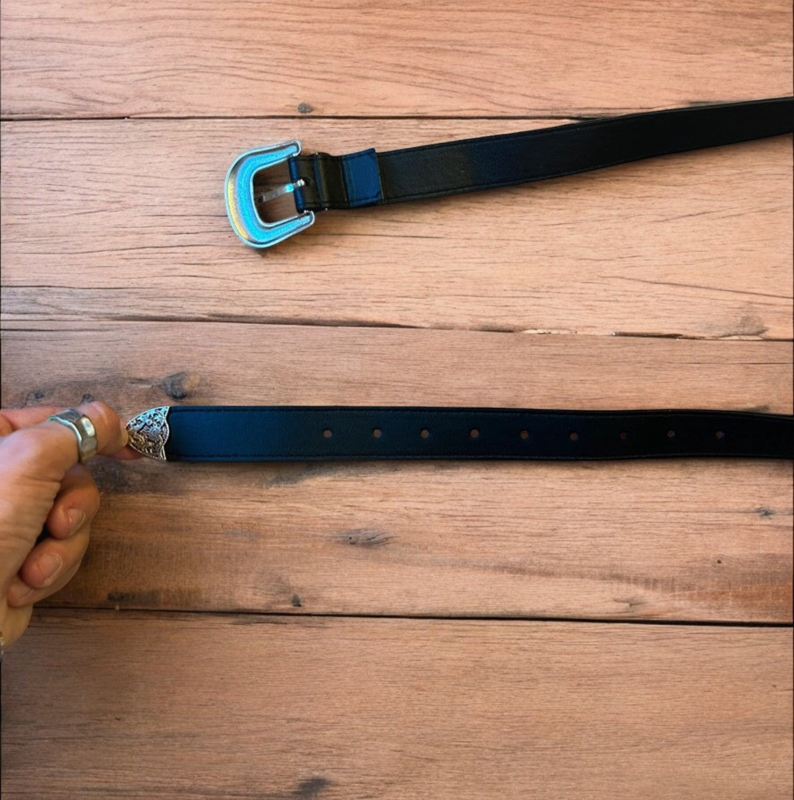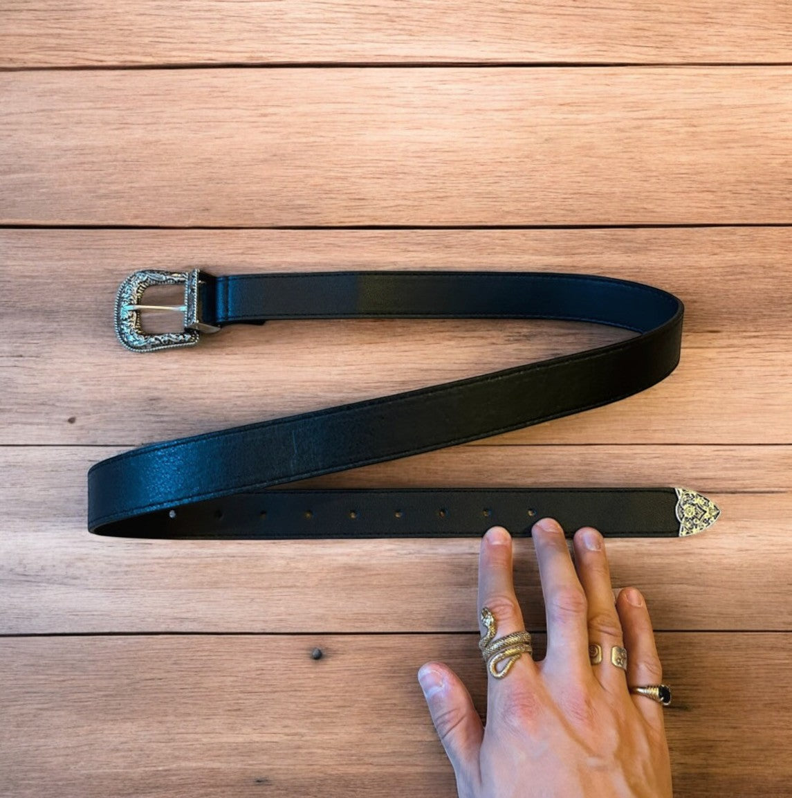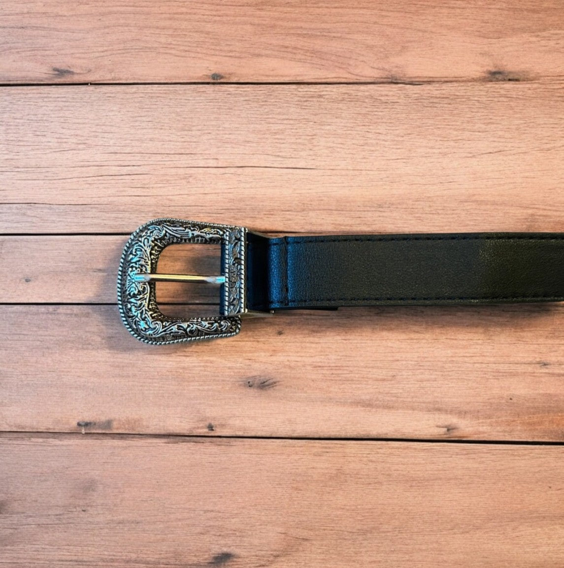 Vintage style faux leather western cowboy belt in black with silver trim. 105cm.