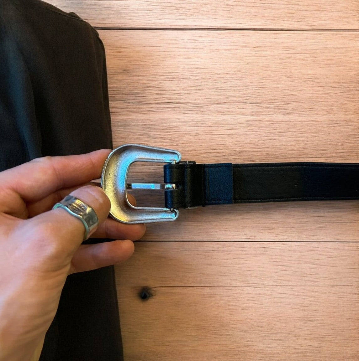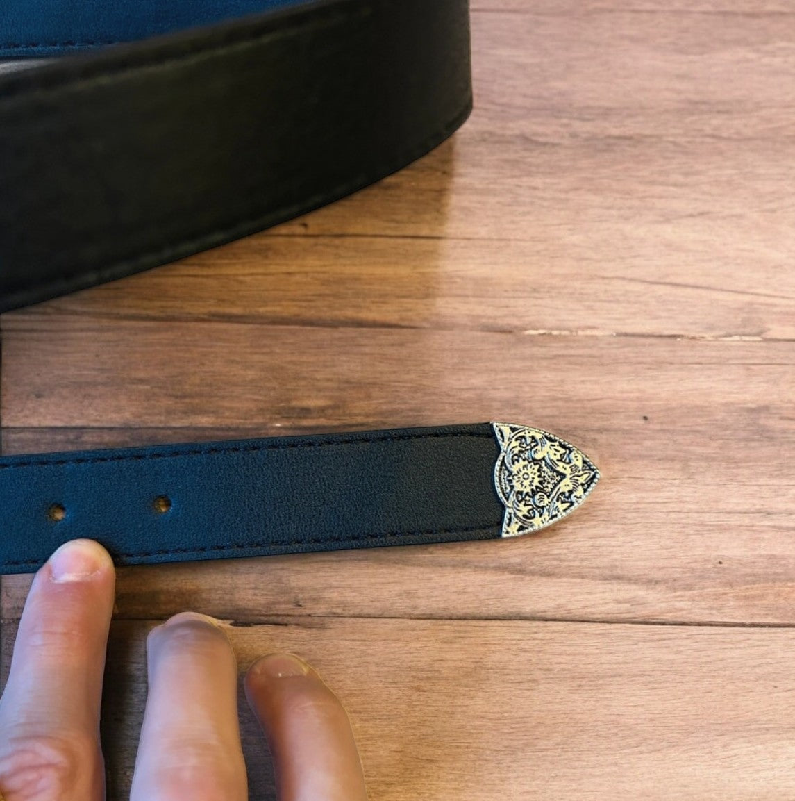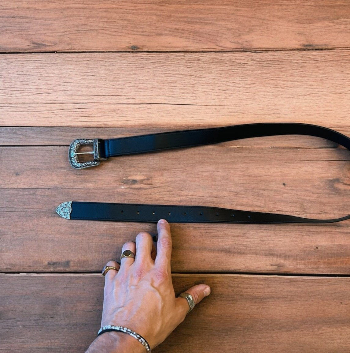 Vintage style faux leather western cowboy belt in black with silver trim. 105cm.