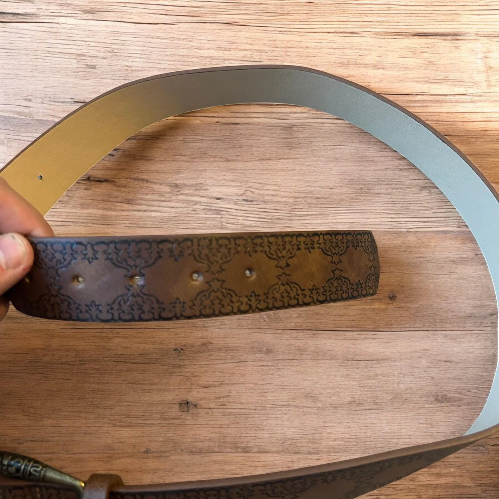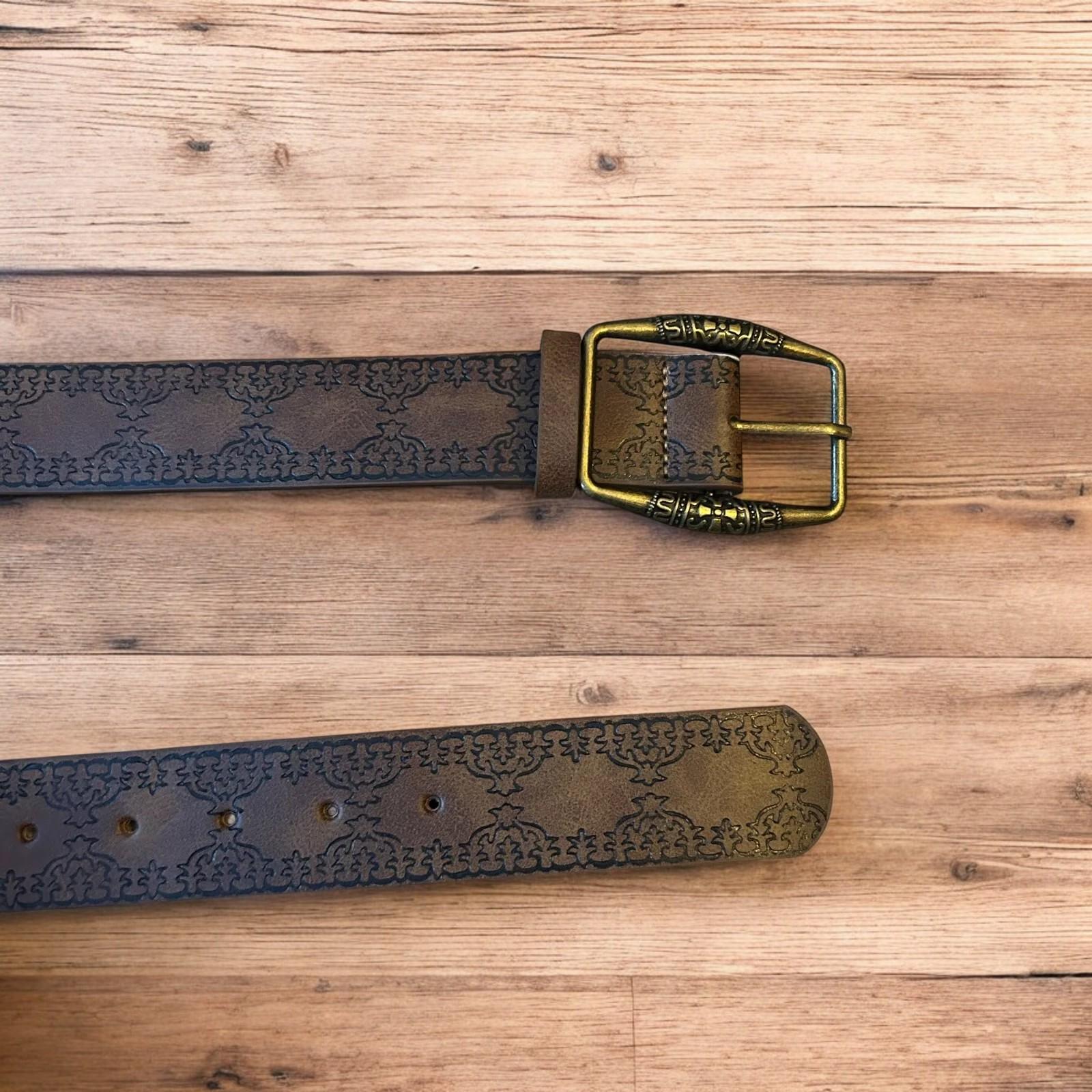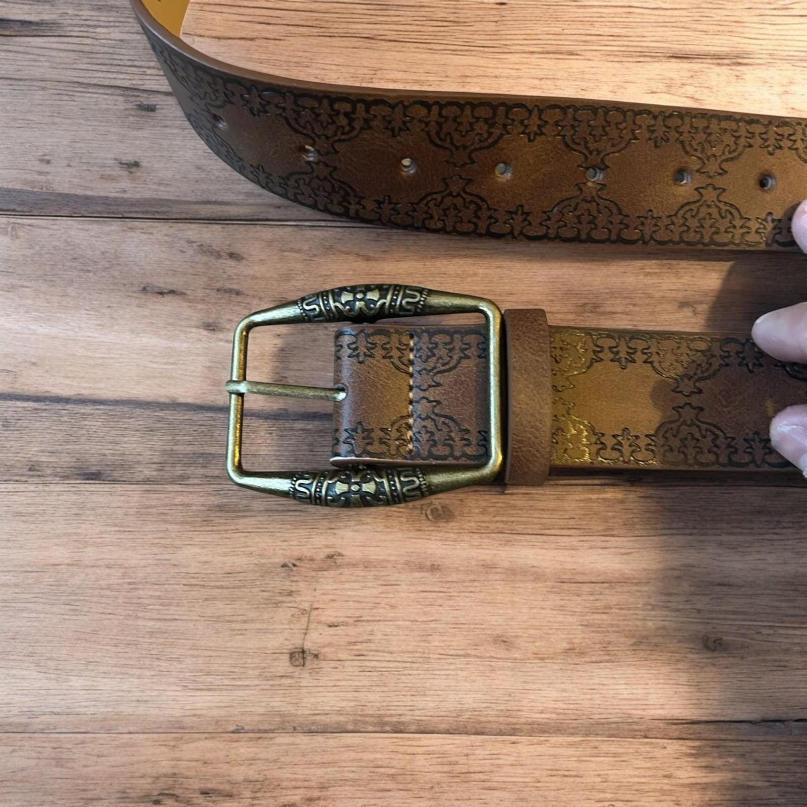 Vintage style faux leather western cowboy belt in brown with bronze trim. 105cm.