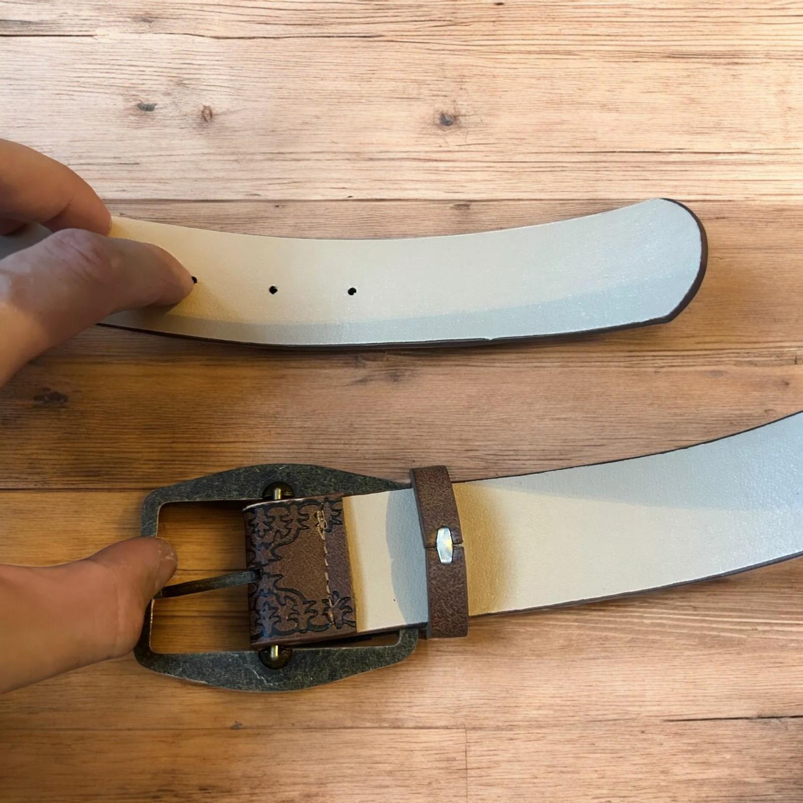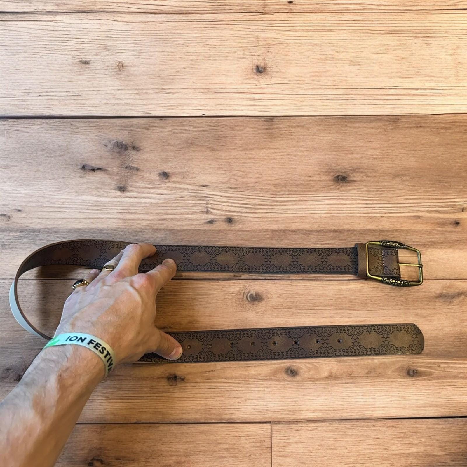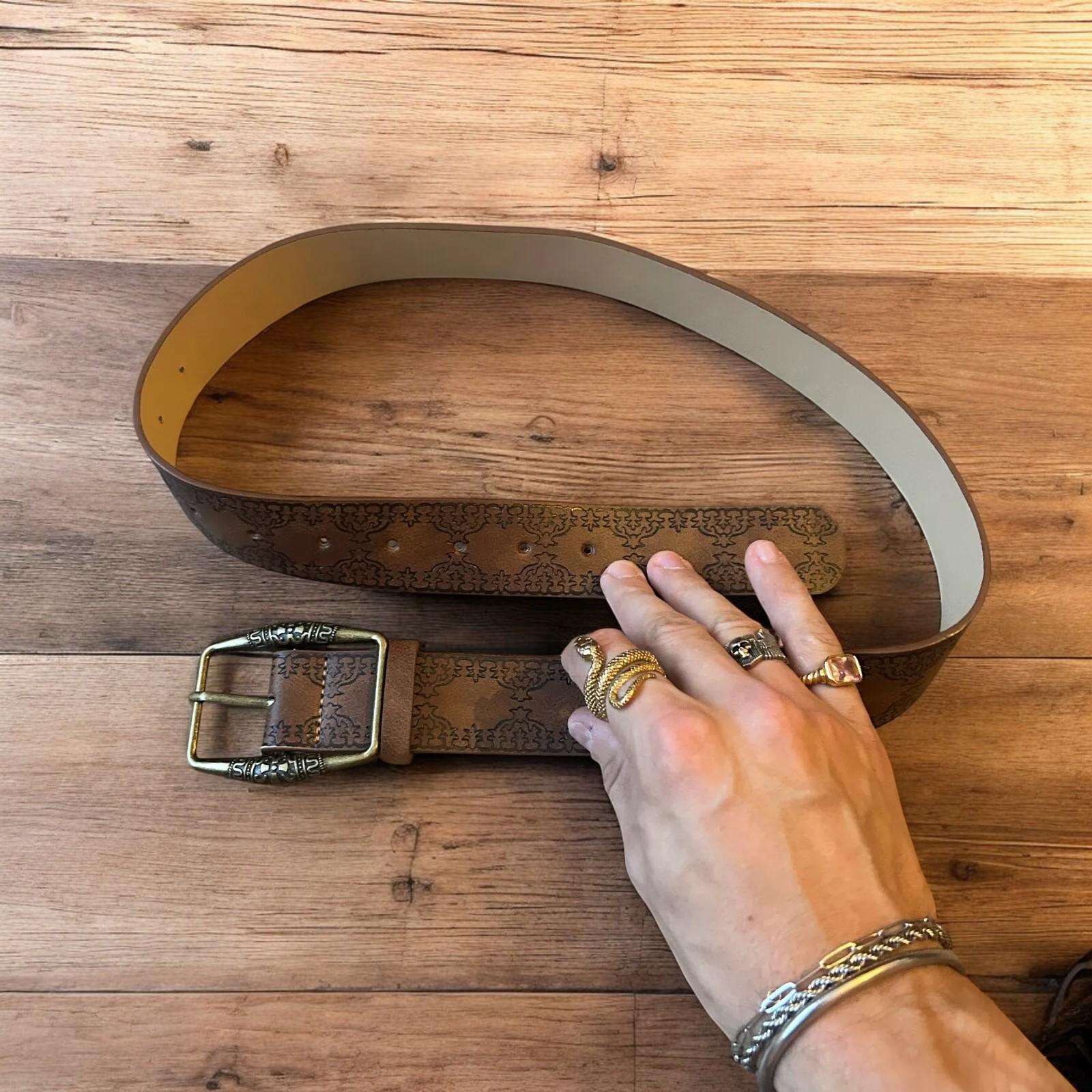 Vintage style faux leather western cowboy belt in brown with bronze trim. 105cm.