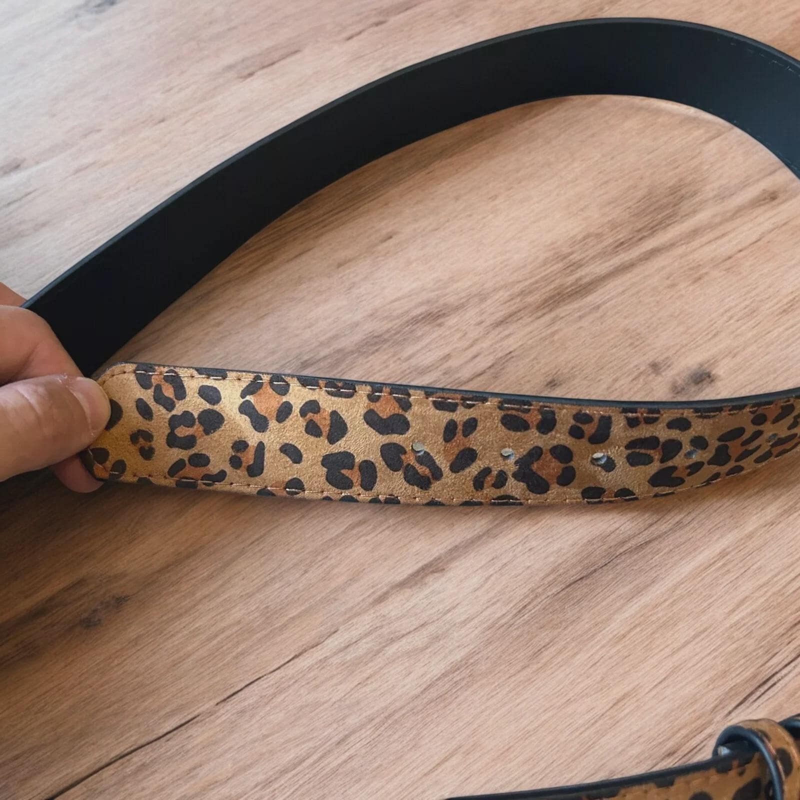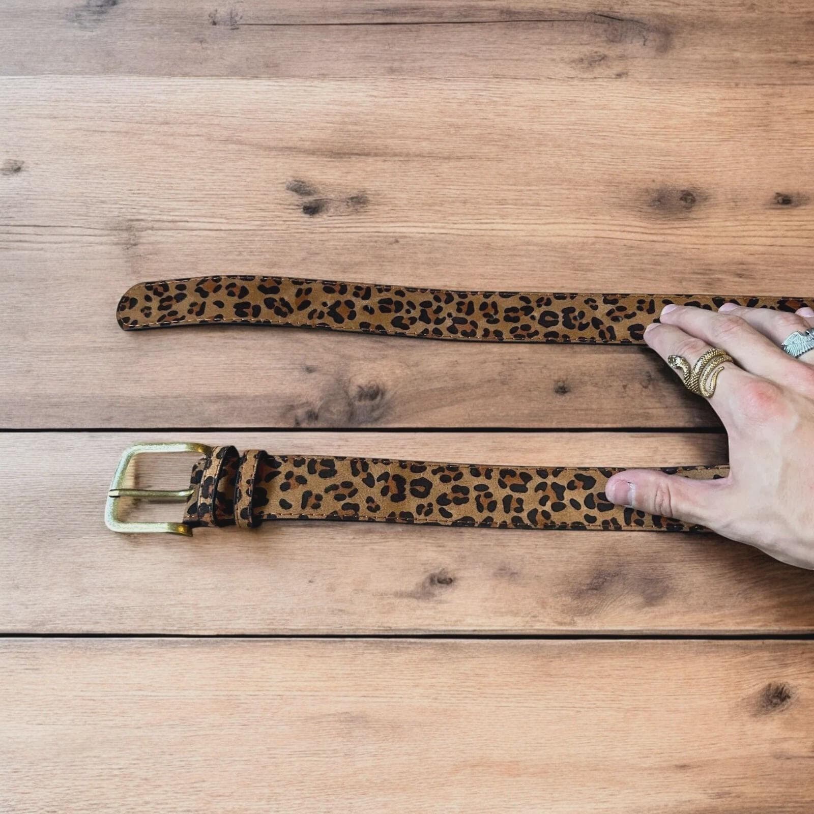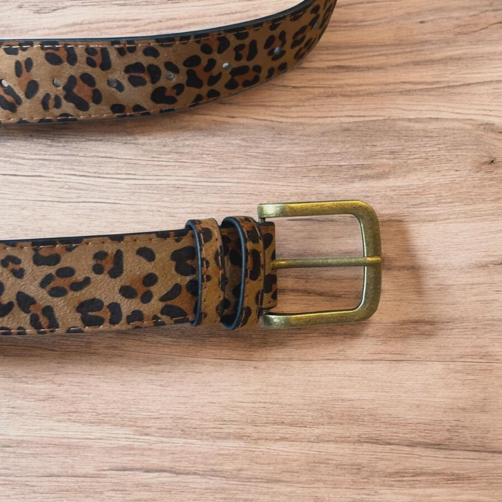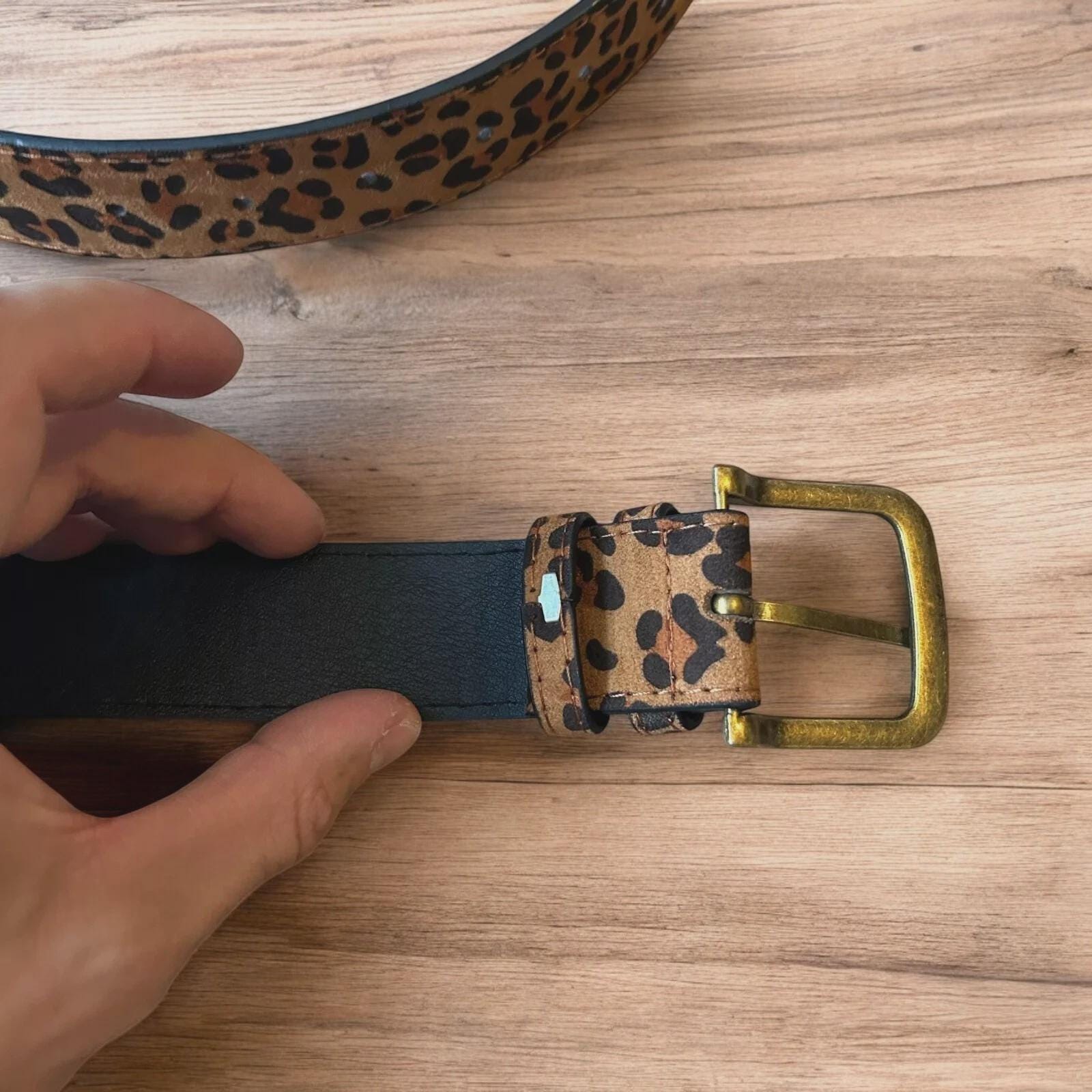 Vintage style faux leather western leopard cowboy belt with bronze trim. 105cm.