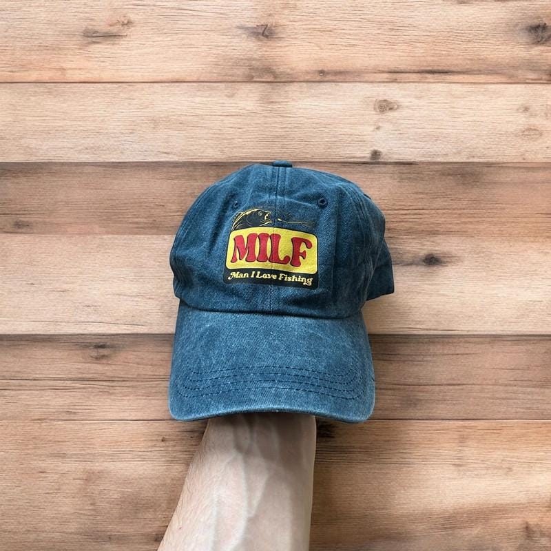 Vintage style Milf fishing cap hat in washed navy blue. One size fits all.