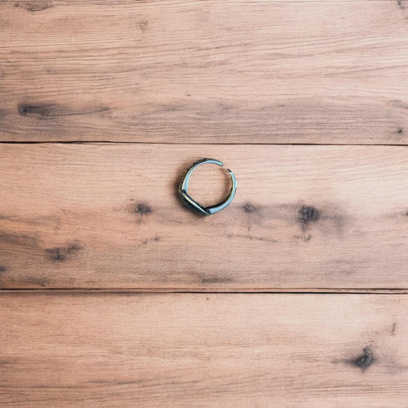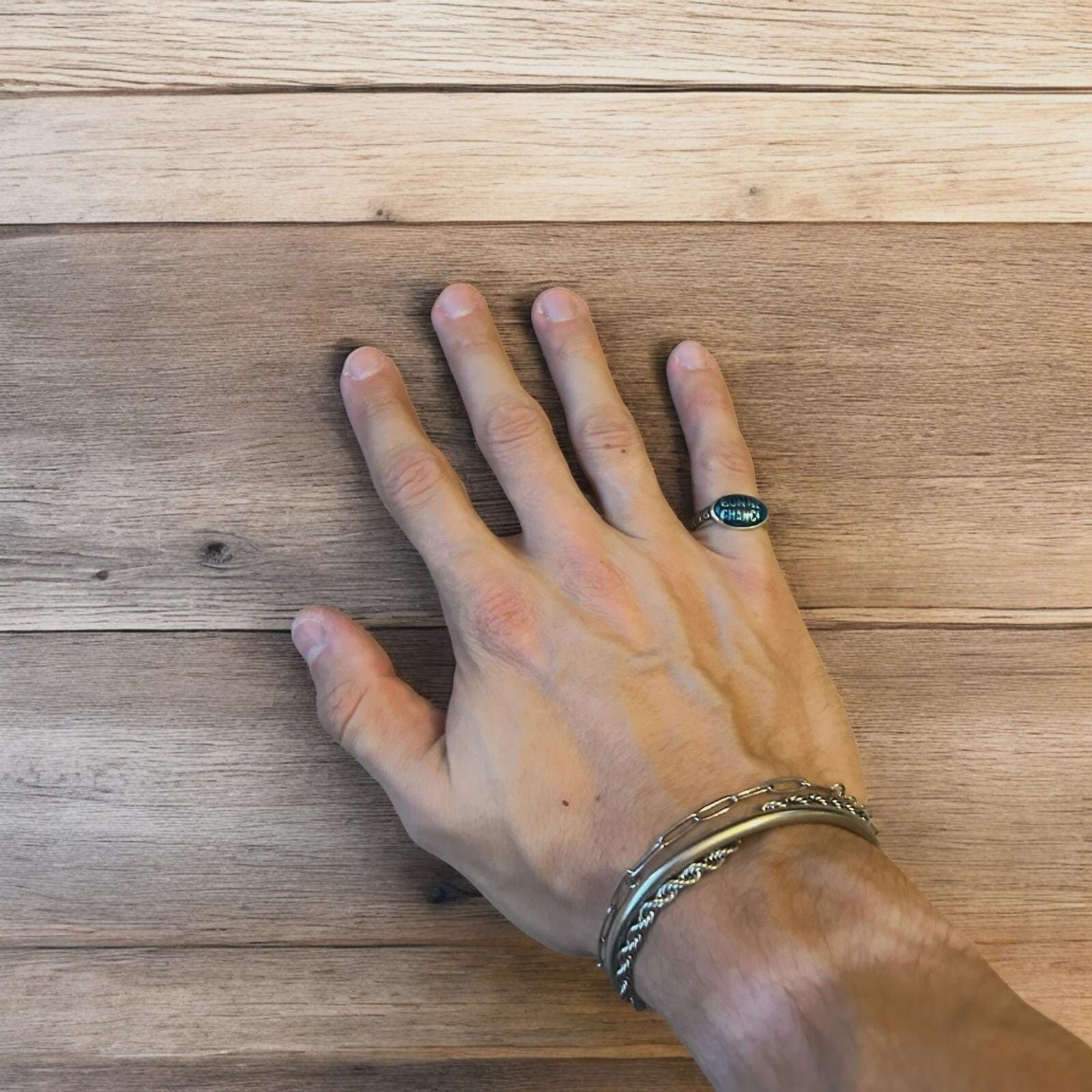 Great condition hardly used. Tarnish resistant. Never goes green in water. Size can be adjusted to fit any finger with pliers. Strong resistant stainless steel material. Signet ring.