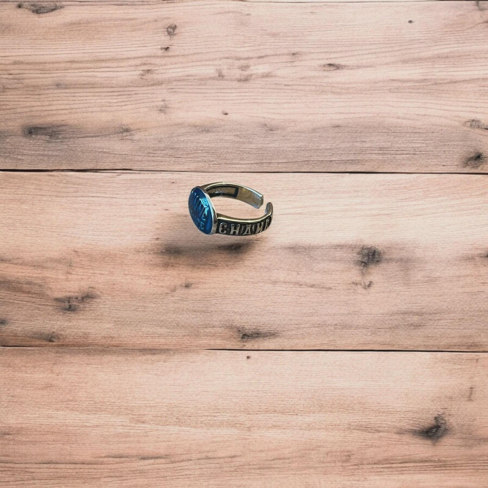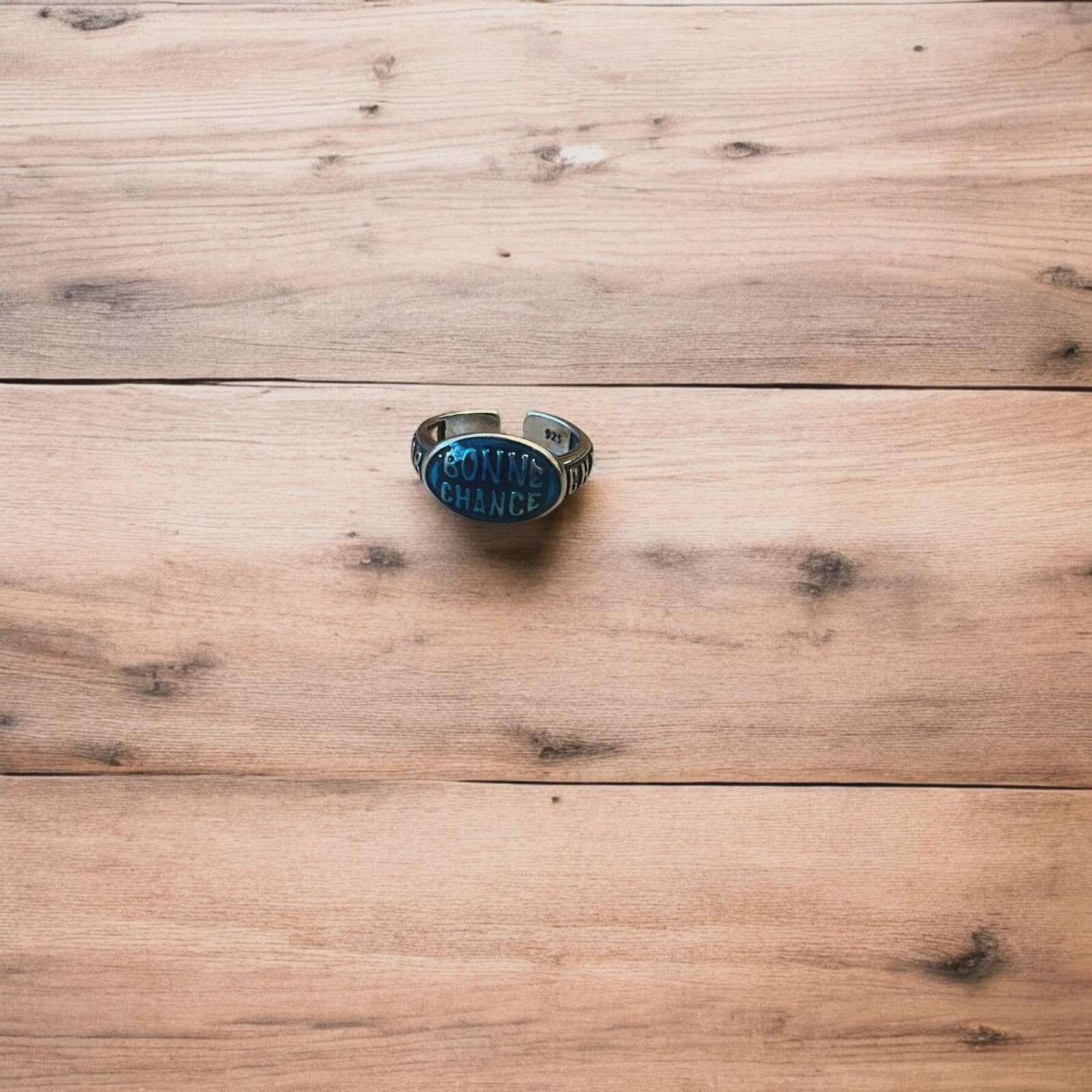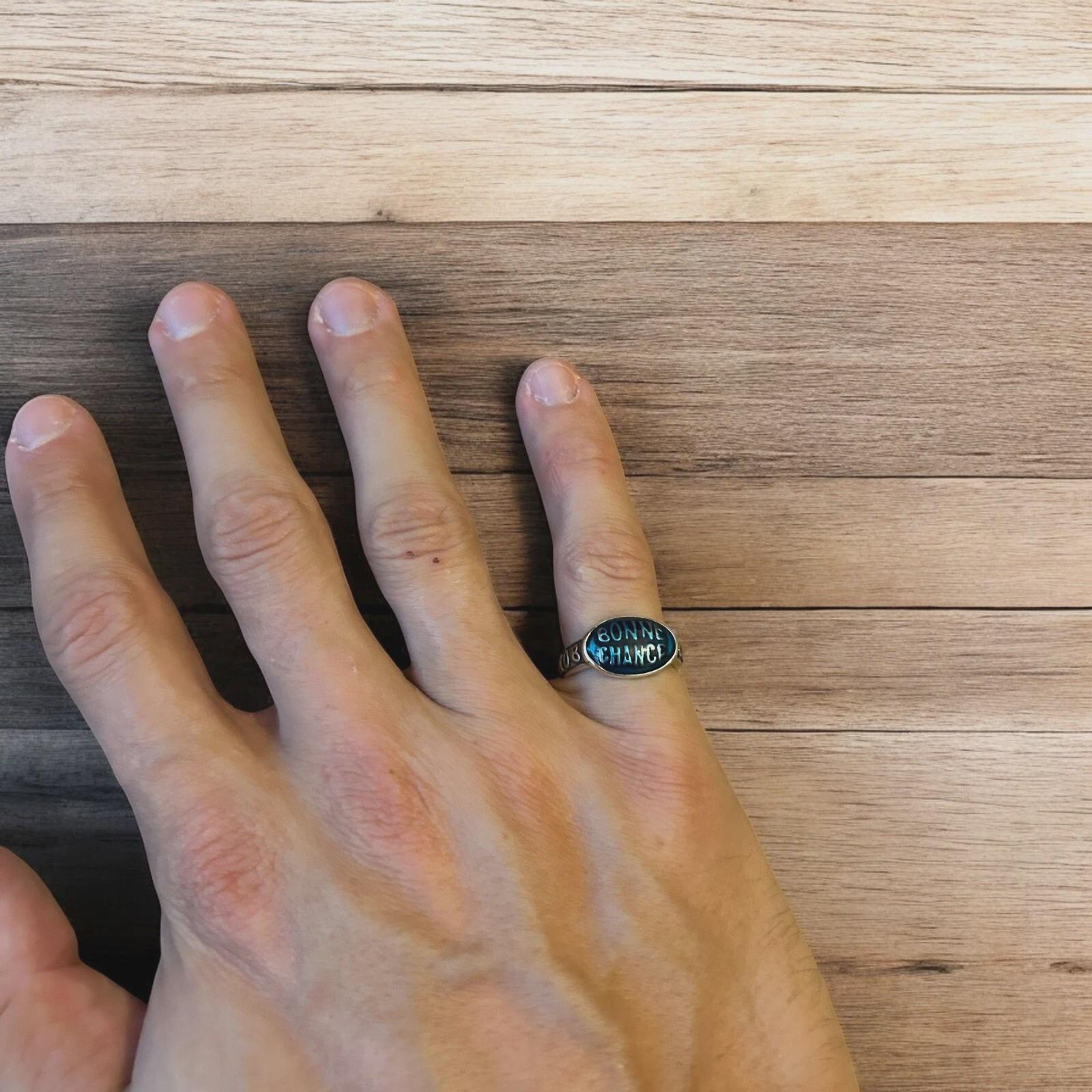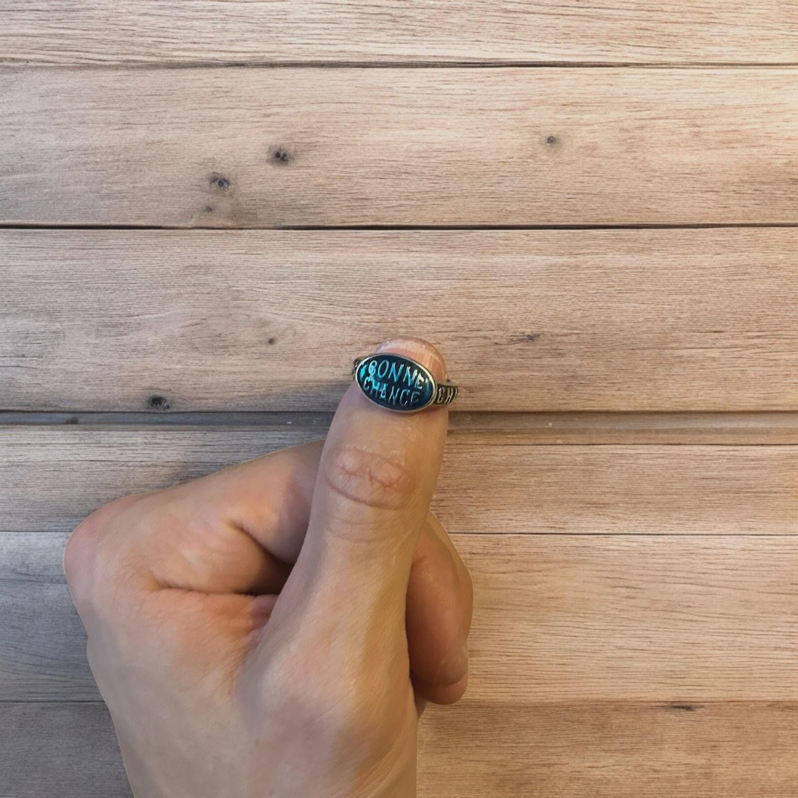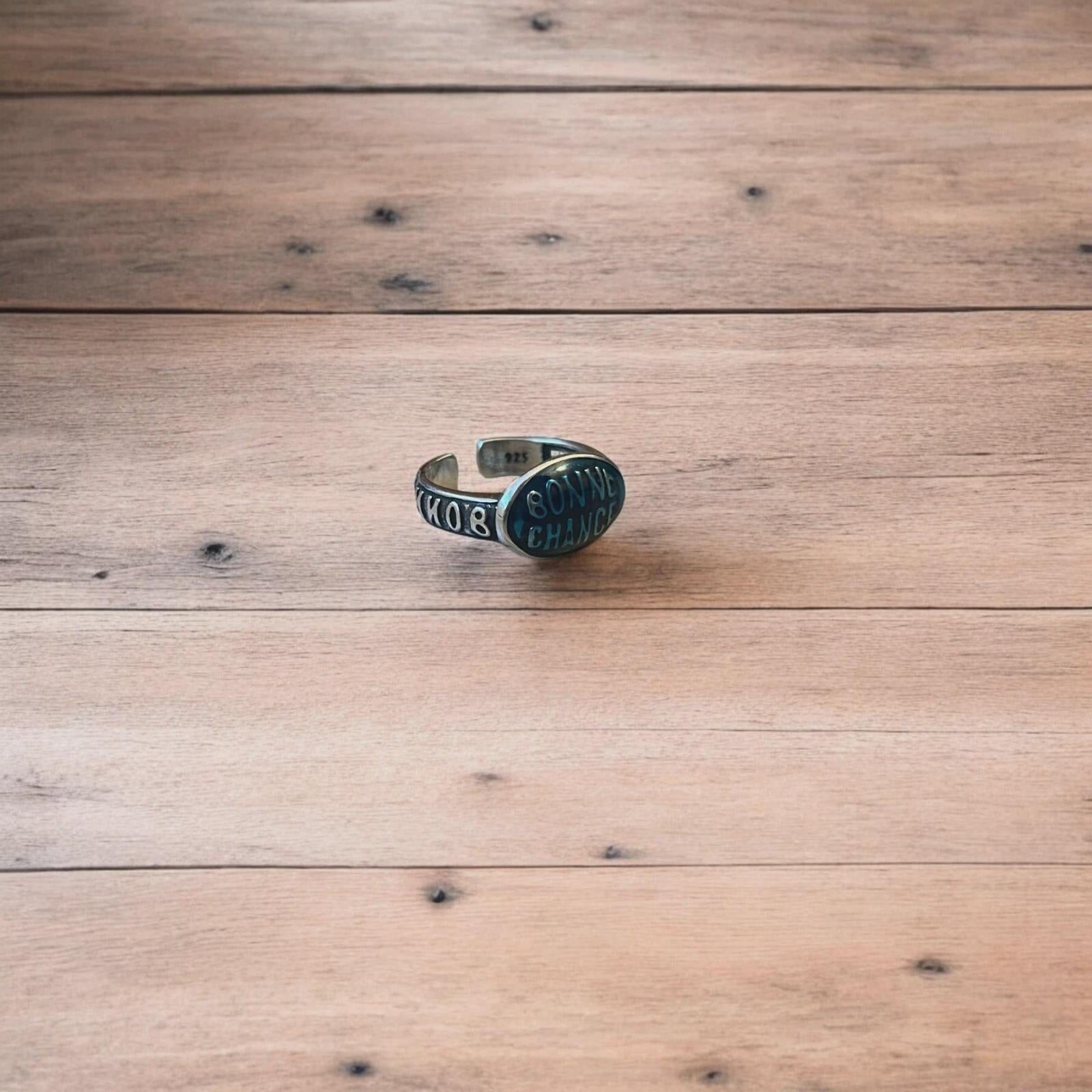 Vintage style stainless steel Bonne Chance ring in silver/ blue. One size.