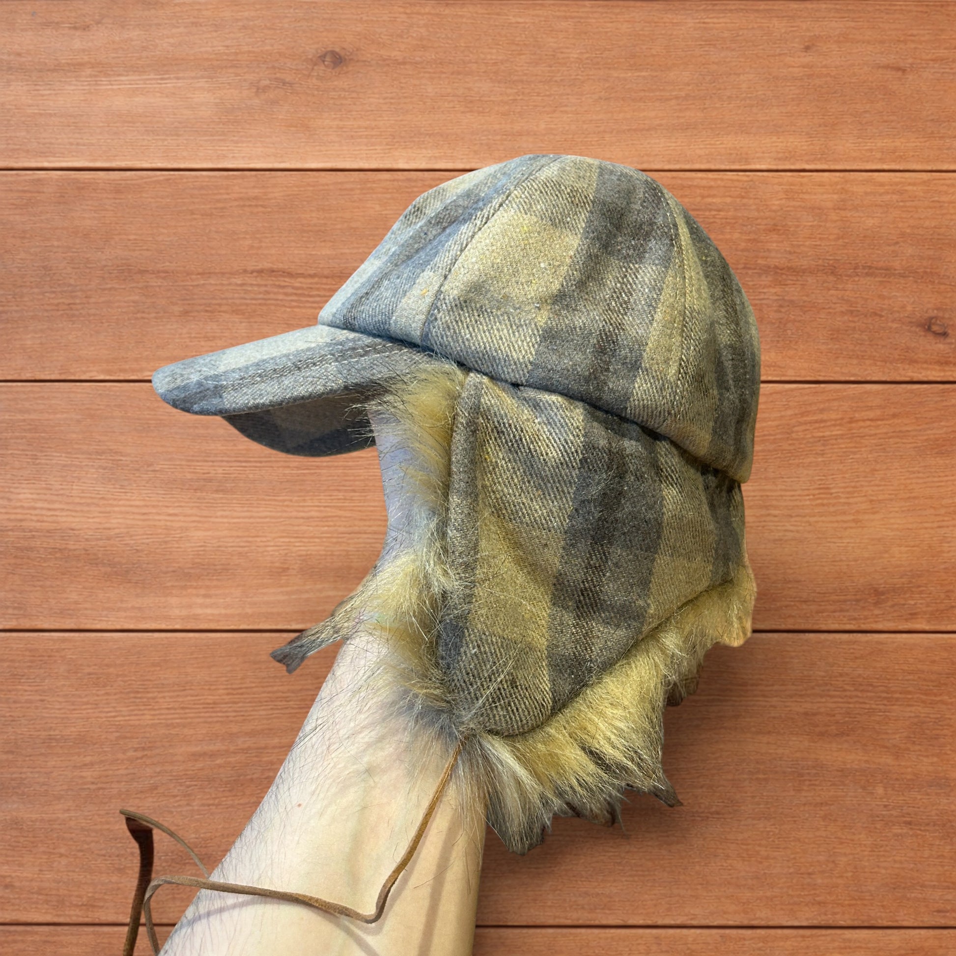 Vintage style trapper Russian ear flap hat cap in checkered beige colour way.
