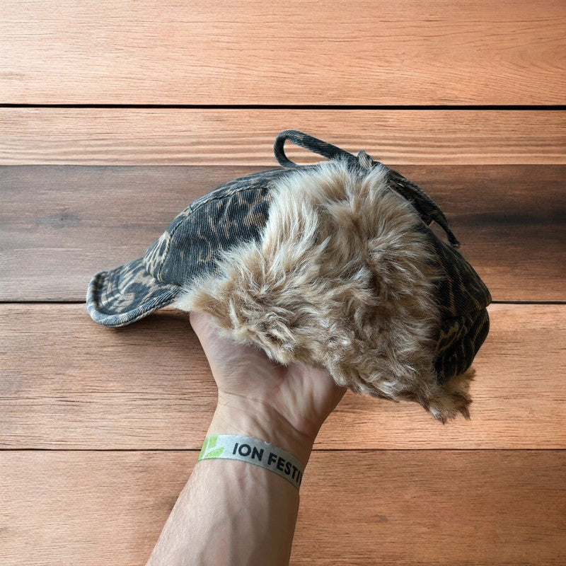 Incredible hat - one of my personal favourites! Fits 54cm - 60cm head size. Great used condition. Leopard print cotton material with fluffy warm detail. Ties can be secured up or down. Vintage Korean Japanese style. Super warm and comfy ideal for the colder winter months.