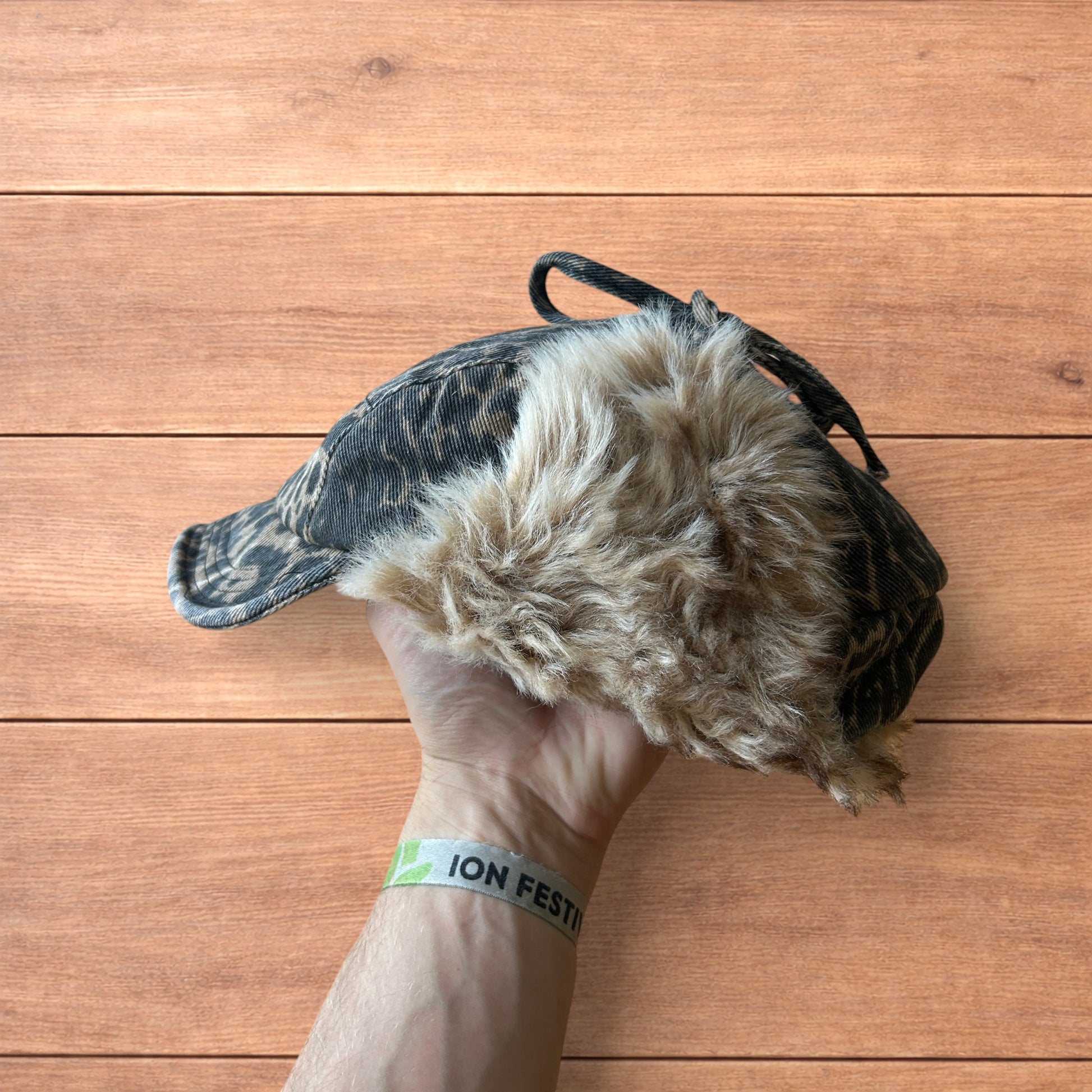 Incredible hat - one of my personal favourites! Great used condition. Leopard print cotton material with fluffy warm detail. Ties can be secured up or down. Vintage Korean Japanese style. Super warm and comfy ideal for the colder winter months.
